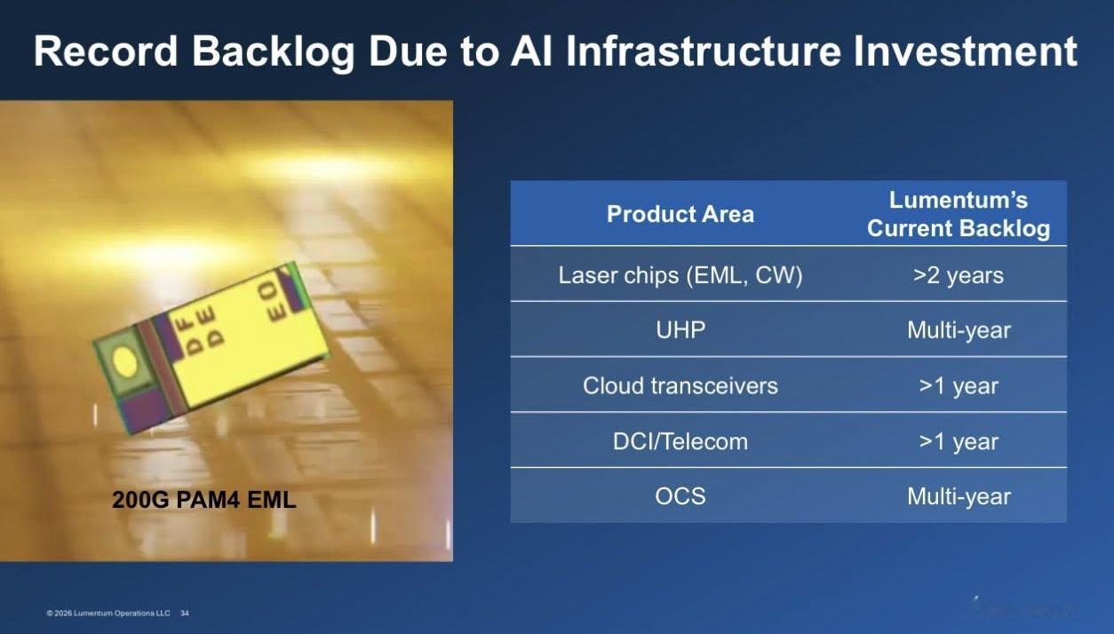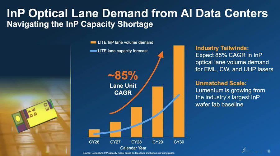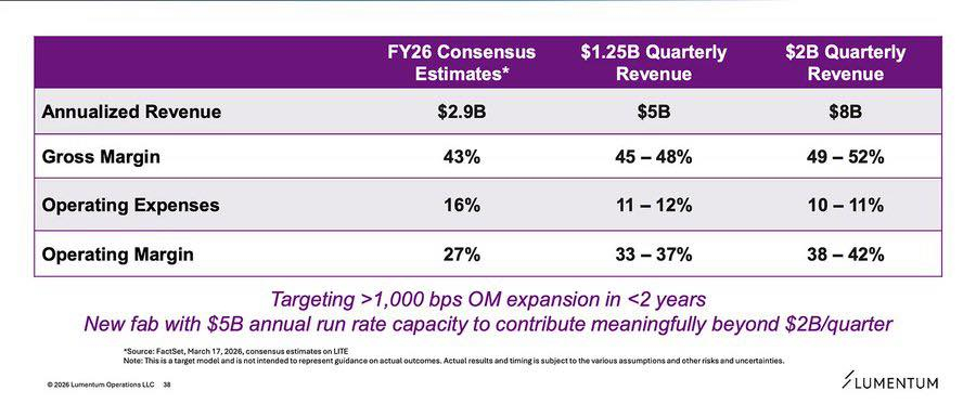 Lumentum昨日在OFC阐述“光进铜退”,呼应黄仁勋“光铜皆需”观点,致Credo股价大跌。2027年底起scale up应用放量,3.2T带宽下2米以上连线全转光,打开光通信增量市场;主动铜缆市场随算力增长扩容,但1.6T升3.2T后空间受限。InP激光需求年增约85%,公司产能全球最大,扩产仍供不应求。3月17日完成收购Qorvo美国北卡晶圆厂,2028年出货,预计年贡献营收50亿美元。订单积压严重:激光芯片超2年、UHP激光数年、光收发器与DCI超1年、OCS数年。AI光通信至2030年营收年复合增速40%,scale up需求占比由0升至45%。Lumentum激光、OCS技术领先。华尔街预期2026财年营收29亿美元,本季8.5亿。内部目标:9个月后单季营收12.5亿(年化50亿)、营业利润率增10%,审慎延至12个月;再9个月后单季20亿、毛利率50%,同样延至12个月。