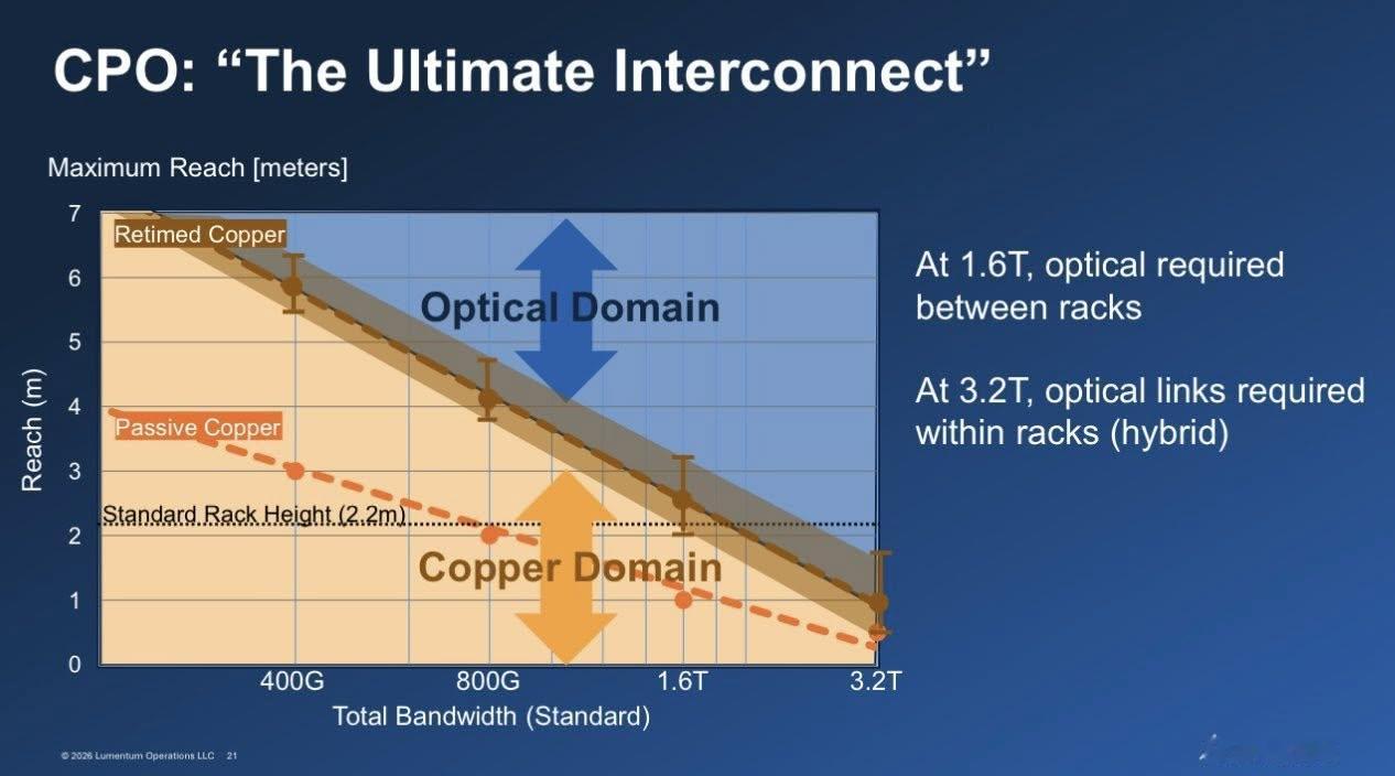 注:Credo超 90% 收入来自有源铜缆(AEC),主打 ** 机架内 / 短距(≤5 米)** 高速连接。当带宽从1.6T 升级到 3.2T,2 米以上铜缆被光取代,铜缆市场空间被大幅压缩。