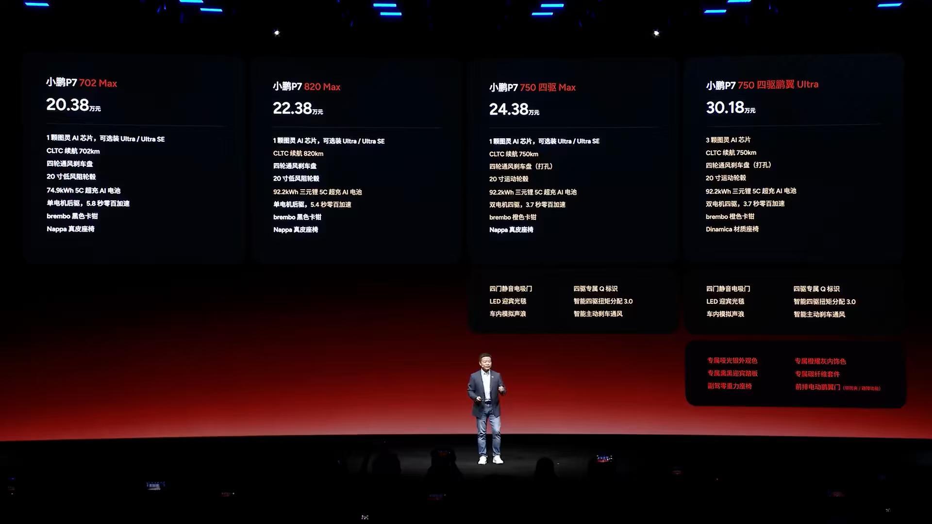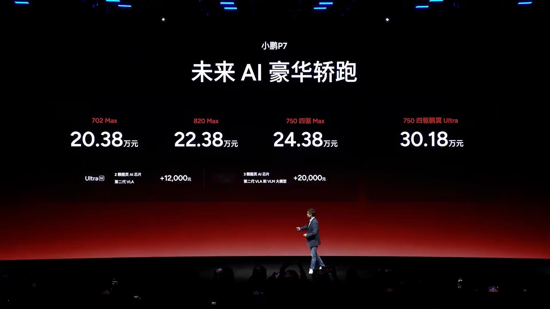 价格和版本划分上,这次小鹏P7的产品线也比较明确:702 Max 售价 20.38 万元820 Max 售价 22.38 万元750 四驱 Max 售价 24.38 万元750 四驱鹏翼 Ultra 售价 30.18 万元官方把图灵AI芯片、第二代VLA,以及VLM大模型作为高阶版本的主要卖点来讲。其中:Ultra SE 配备 2 颗图灵AI芯片,可选装第二代VLA,加价1.2万元;Ultra配备3颗图灵 AI 芯片,支持第二代VLA和VLM大模型,加价2万元。小鹏P7新色今日发布小鹏P7这次太全面了