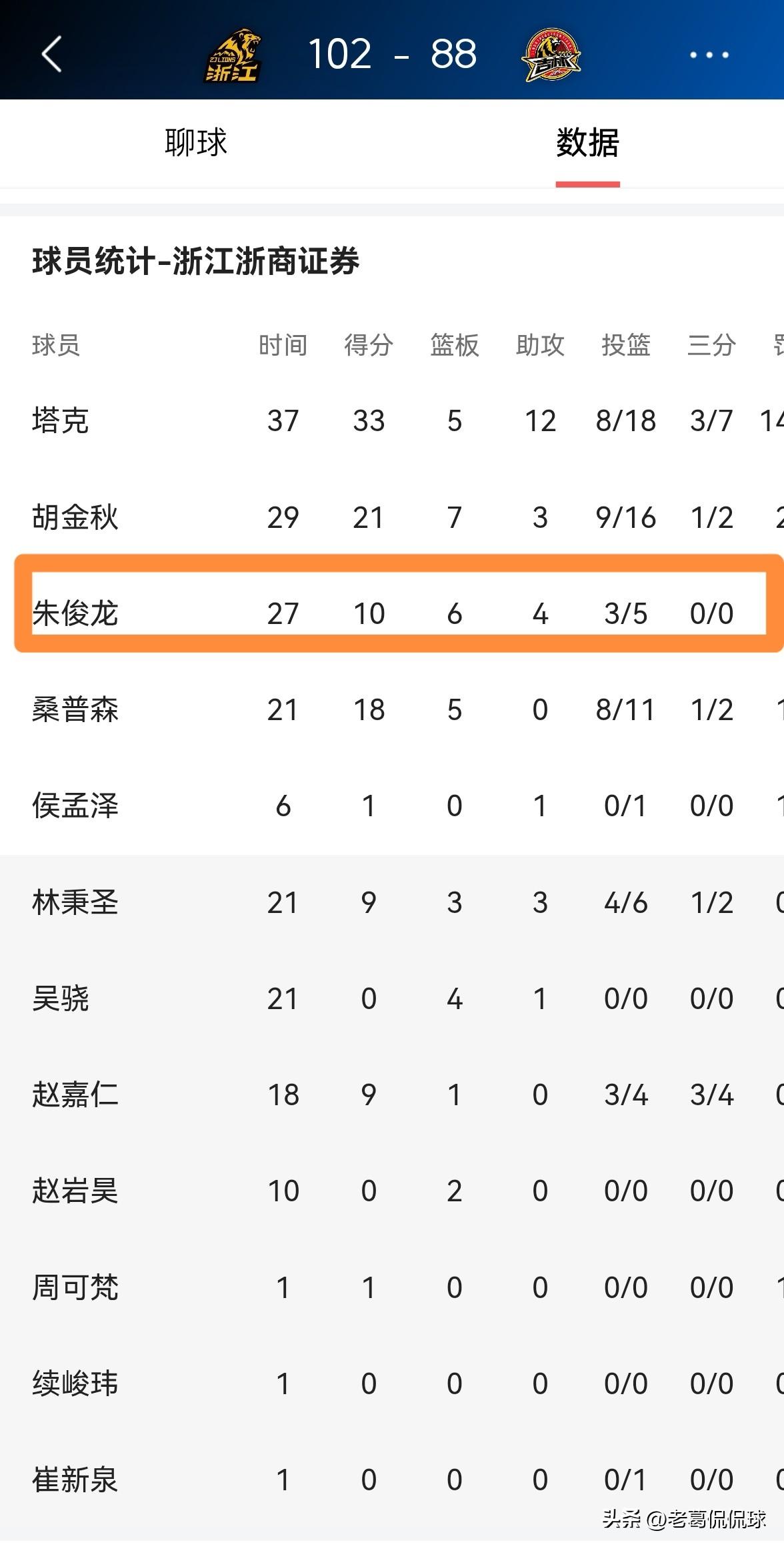 浙江浙商证券大将朱俊龙真是攻防俱佳!在今天浙江浙商证券主场以102:88击败长白山恩都里的比赛中,朱俊龙在攻防两端都打出了无可挑剔的表现。 全场比赛下来,朱俊龙首发出战27分钟,投篮5中3,其中罚球4中4非常高效的得到10分,外加6篮板4助攻1抢断,没有出现任何的失误,他的场上正负值为+11。 实事求是的说,中国男篮和浙江浙商证券能够拥有朱俊龙这样的好球员真是太幸运了。话说回来,哪支球队不想拥有朱俊龙这样的球员呢?