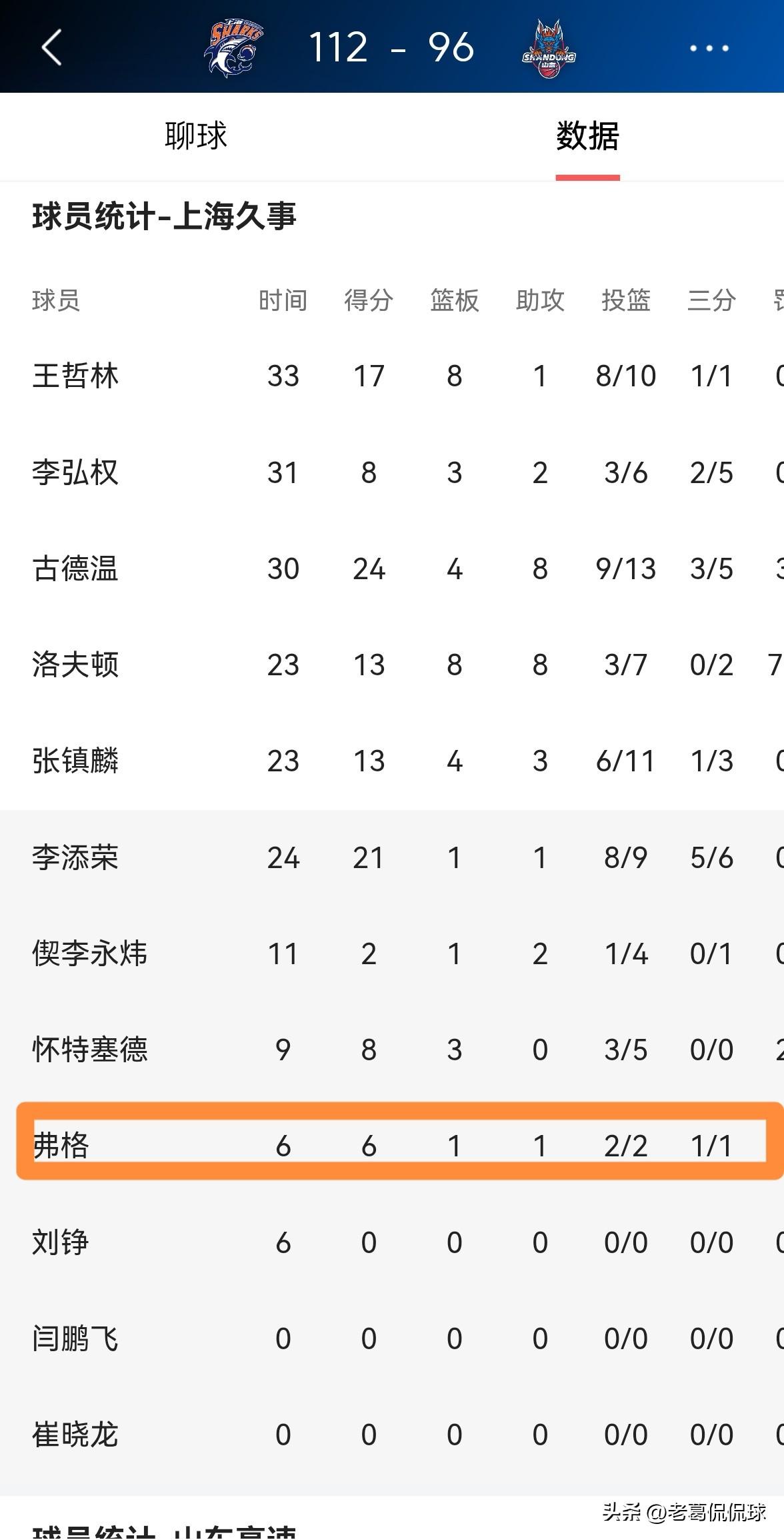 上海久事外援弗格的上场时间真是太少了!在今天上海久事主场以112:96大胜山东高速的比赛中,老将弗格在状态不错的情况下仅仅得到了6分钟的上场时间,投篮2中2,其中三分球1中1、罚球1中1得到6分,还有1篮板1助攻。 实事求是的说,以弗格目前的竞技状态来看,他完全值得更多的上场时间。卢伟教练应该在接下来的比赛中给予弗格更多的上场时间才行,这样的话弗格就可以将自己的好状态延续到季后赛,众所周知,季后赛中的弗格可是一把利器。