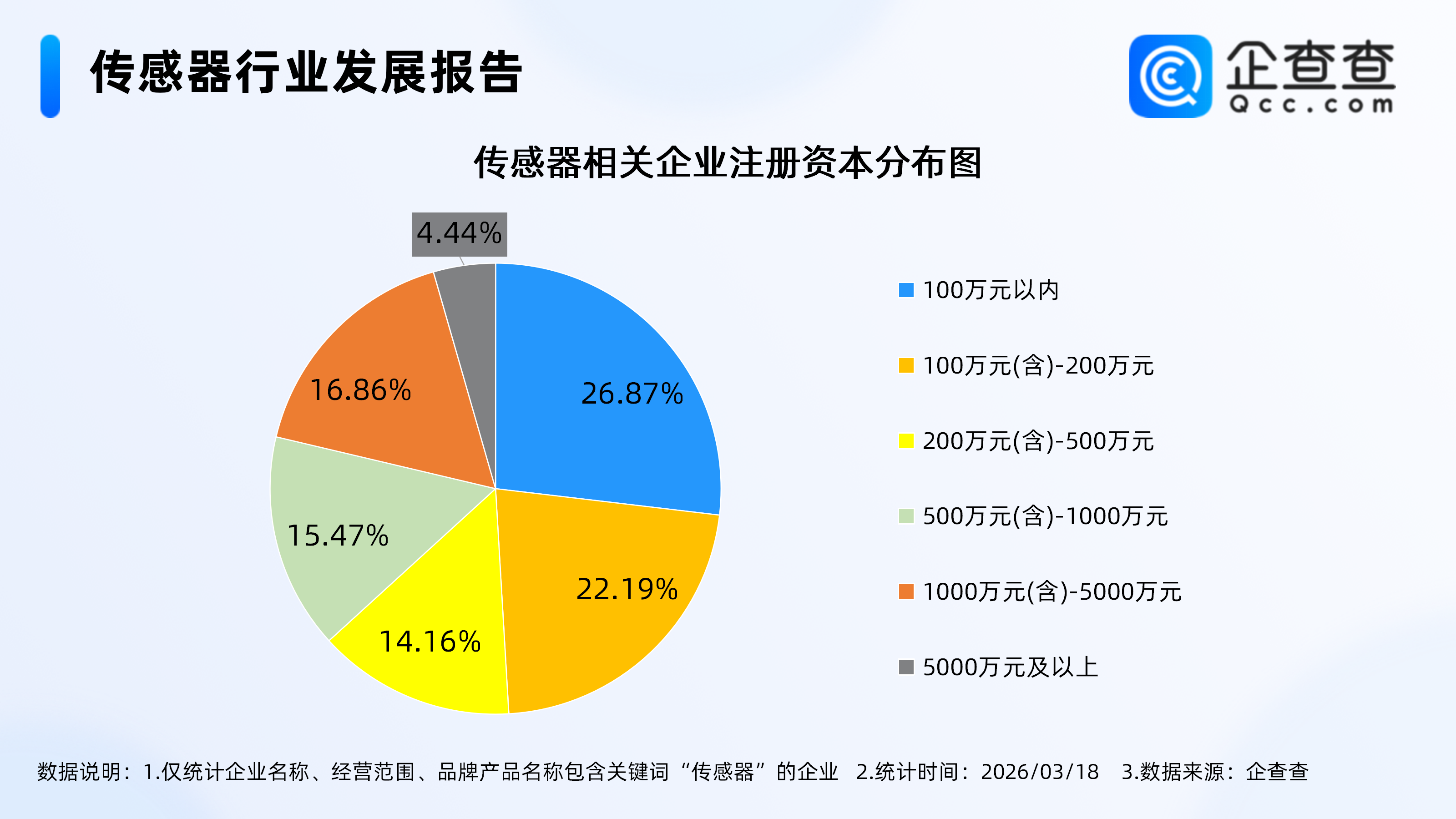 企查查数据显示,从注册资本分布来看,传感器相关企业多为轻量化企业,注册资本在200万元以下的相关企业合计占比近半。其中注册资本在100万元以内的企业占比26.87%,注册资本在100万-200万元占22.19%。此外,注册资本在千万级以上的相关企业合计占比21.31%。