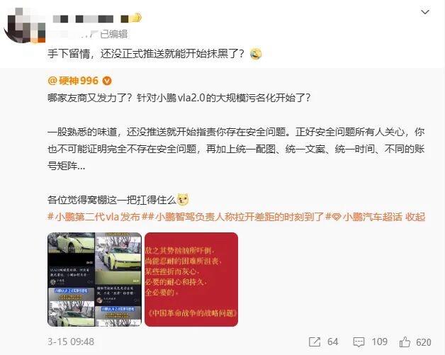 快讯!小鹏第二代VLA未正式推送,已遭全网恶意抹黑,何小鹏直播谈及相关争议时罕见沉默,引发全网热议。 据悉,争议源于何小鹏关于VLA与特斯拉FSD国外版本的对比言论被断章取义,衍生嘲讽梗,各类伪造智驾失效视频、虚假测评刷屏。 小鹏用实力回应质疑:VLA横穿中国实测单日千公里零接管,全栈自研架构摆脱高精地图依赖,安全接管里程大幅提升,全国门店已开启试驾。 纯视觉与激光雷达路线之争再度升温,双方各有优劣。3月19日VLA正式推送,所有争议将由用户实测给出答案,理性看待,拒绝被黑稿裹挟。 小鹏汽车 何小鹏 小鹏VLA于3月19日开启推送