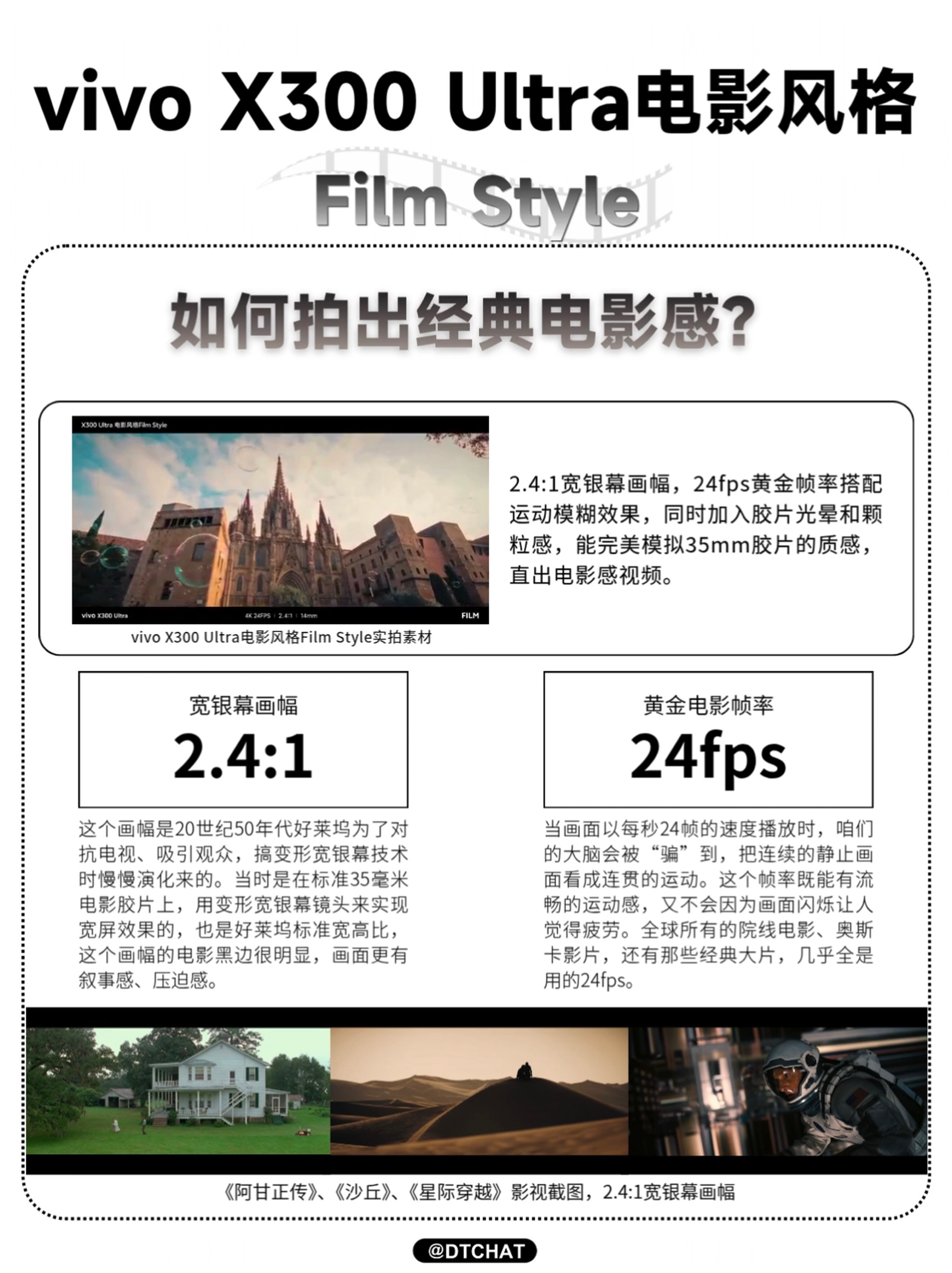 先说说Film Style,蓝厂特意选了2.4:1宽银幕画幅搭配24fps黄金帧率,再加上运动模糊效果,拍出来直接就是电影感大片。可能很多人对4:3、16:9画幅都很熟悉,但对2.4:1画幅就有点陌生了。其实这个画幅,是20世纪50年代好莱坞为了对抗电视、吸引观众,搞变形宽银幕技术时慢慢演化来的。