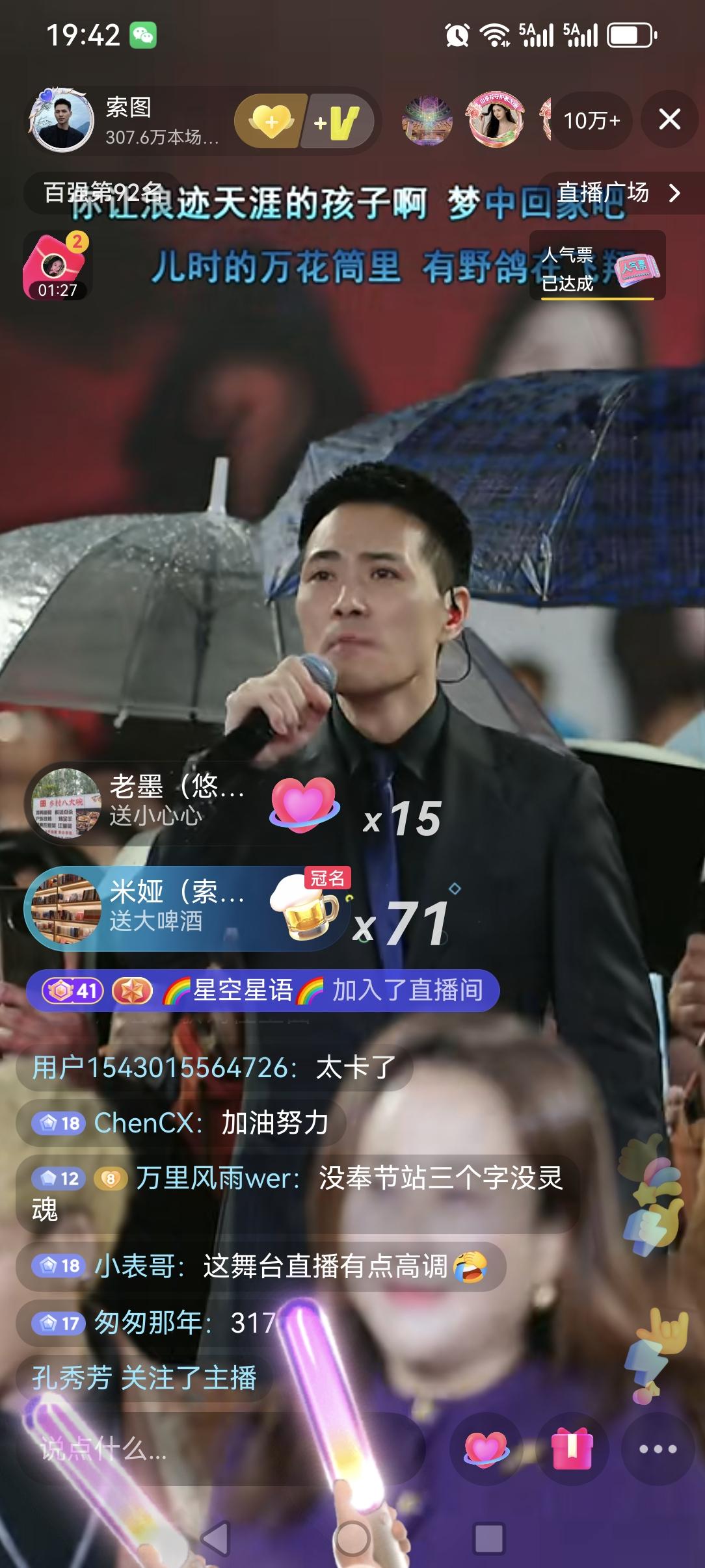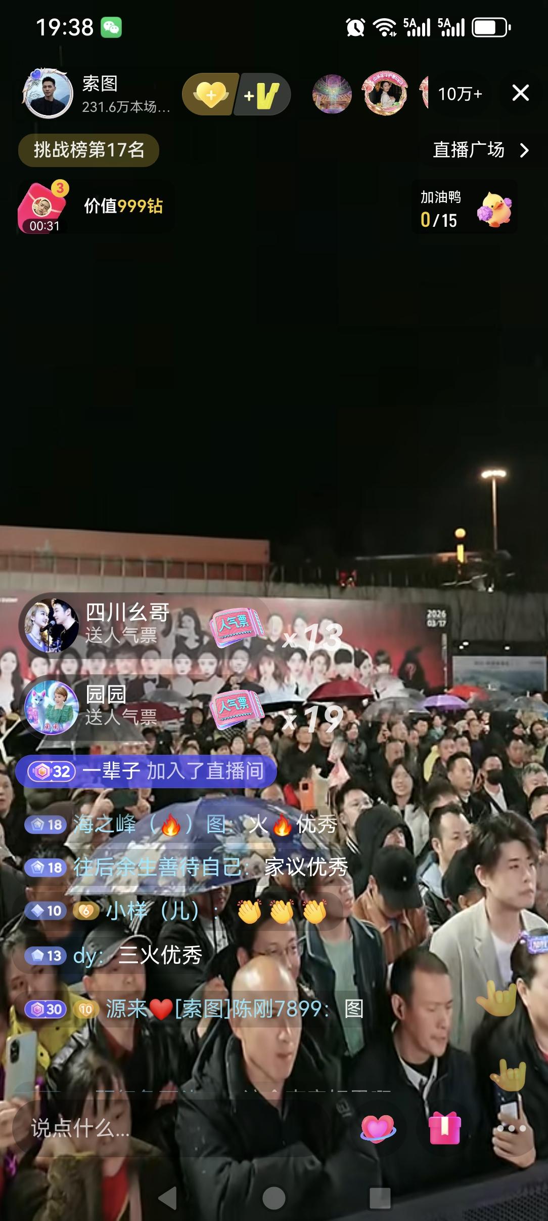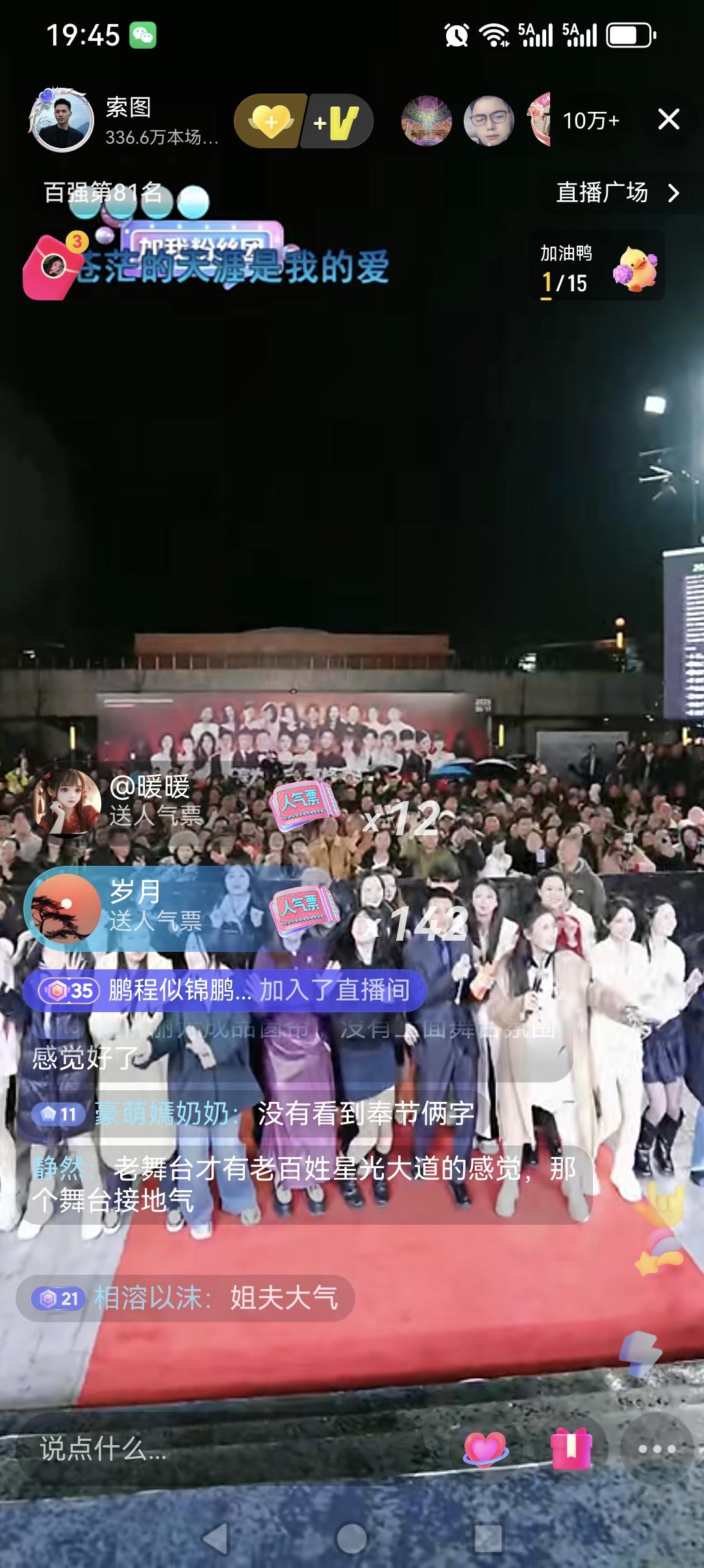 索图大舞台换地方了,离高铁站(奉节站)广场前的大舞台不远。说是高铁站前的大舞台在升级中,在今天晚上还下着雨,现场还是很多人去现场观看,直播五分钟上到十万加,而且上十万加之前,主角索图还没有露面,说明索图的人气,喜欢他的人还是很多很多的,看来索图这也是算是一个抖音直播人气中的王者一个了,现在直播人气十万加的己经不多了,而且现在索图经常都是三五十万的,已经好几个月了,能保持几个月中年的还是不多,而且看这趋势还是会一直保持,希望索图大舞台越办越好!