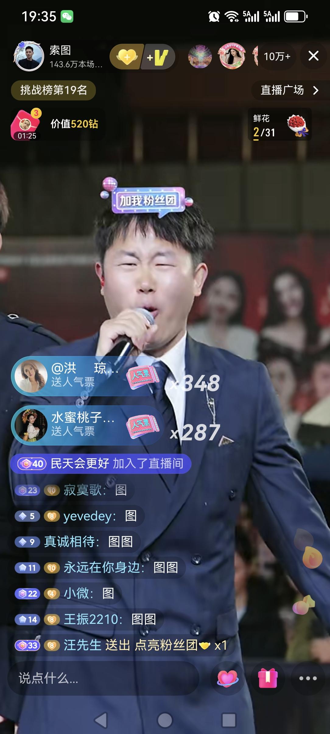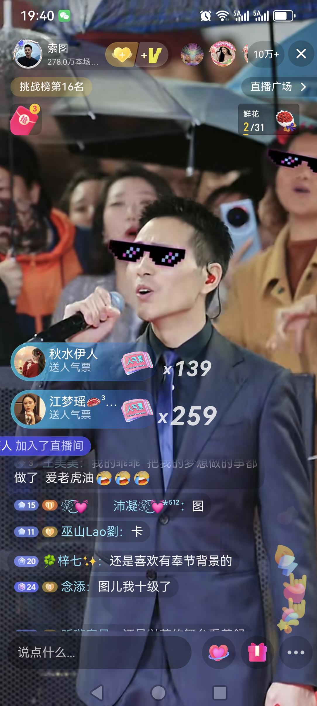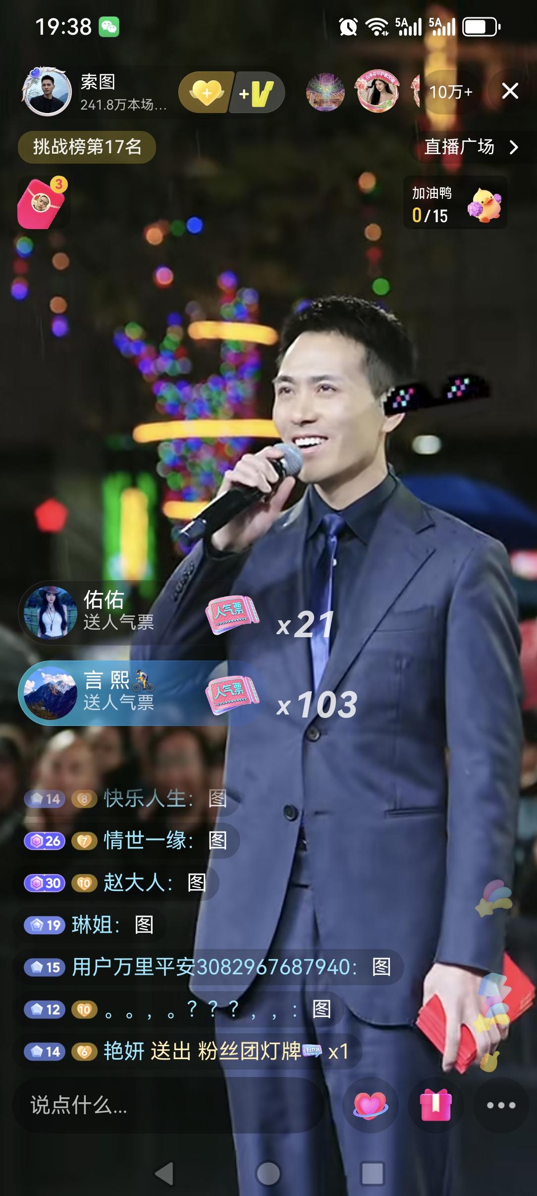 索图大舞台换地方了,离高铁站(奉节站)广场前的大舞台不远。说是高铁站前的大舞台在升级中,在今天晚上还下着雨,现场还是很多人去现场观看,直播五分钟上到十万加,而且上十万加之前,主角索图还没有露面,说明索图的人气,喜欢他的人还是很多很多的,看来索图这也是算是一个抖音直播人气中的王者一个了,现在直播人气十万加的己经不多了,而且现在索图经常都是三五十万的,已经好几个月了,能保持几个月中年的还是不多,而且看这趋势还是会一直保持,希望索图大舞台越办越好!