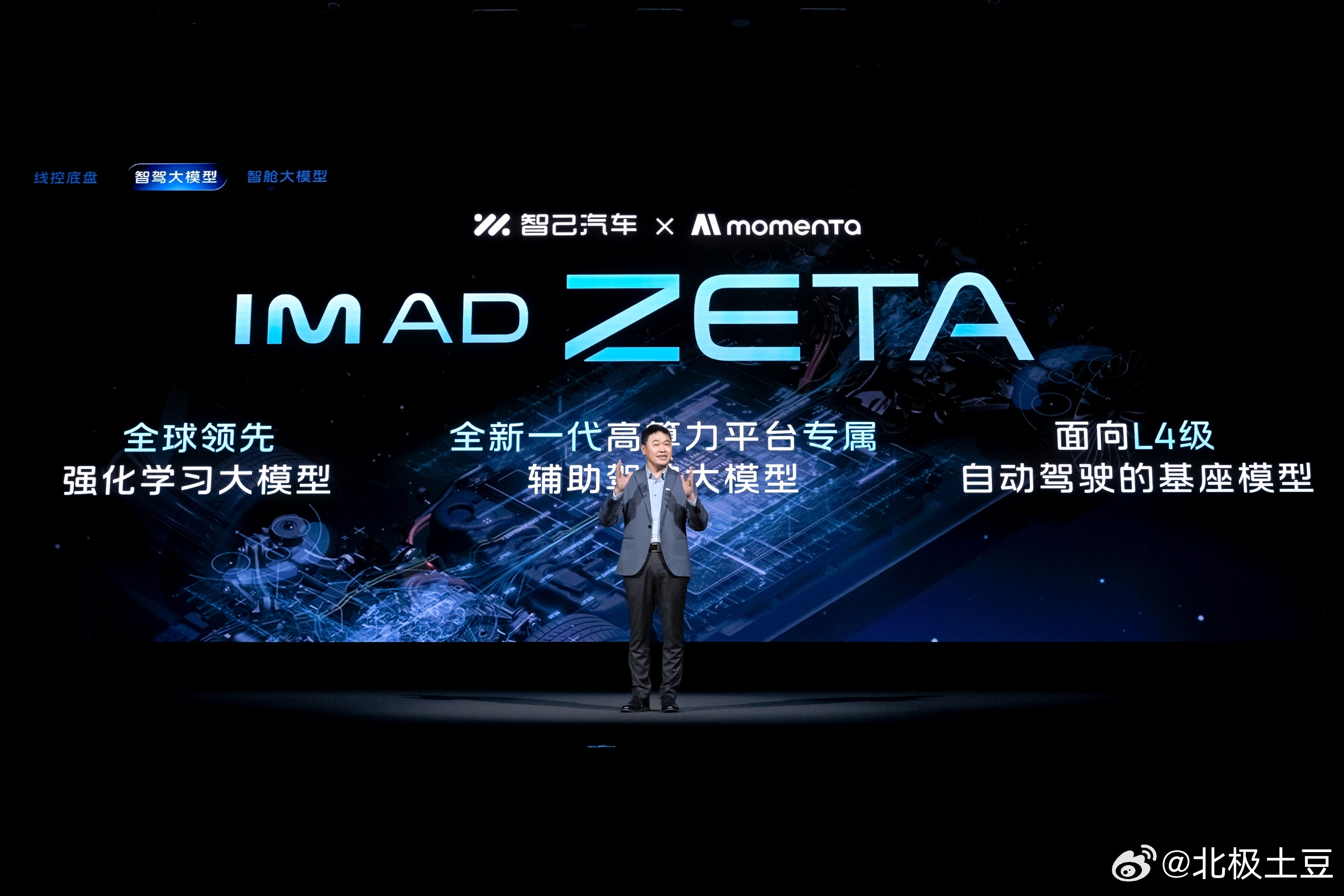 第二层是与Momenta联合打造的IM AD ZETA智驾大模型,基于L4自动驾驶技术研发,性能上限较现有版本提升可达20倍,通过云端强化学习实现预判驾驶,以高阶能力降维赋能日常辅助驾驶。