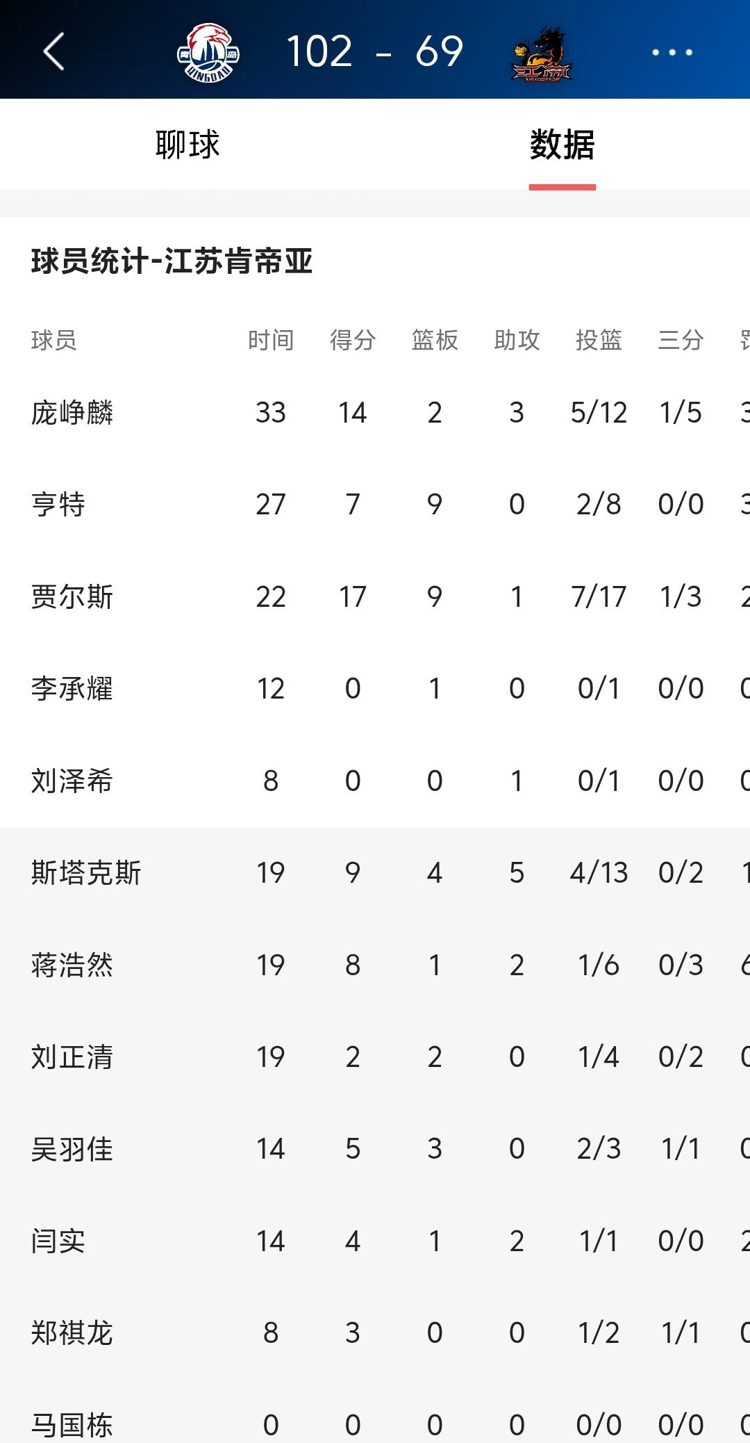 69:102,江苏男篮惨败青岛男篮,这场比赛江苏男篮输的也太惨了,竟然全场仅仅拿