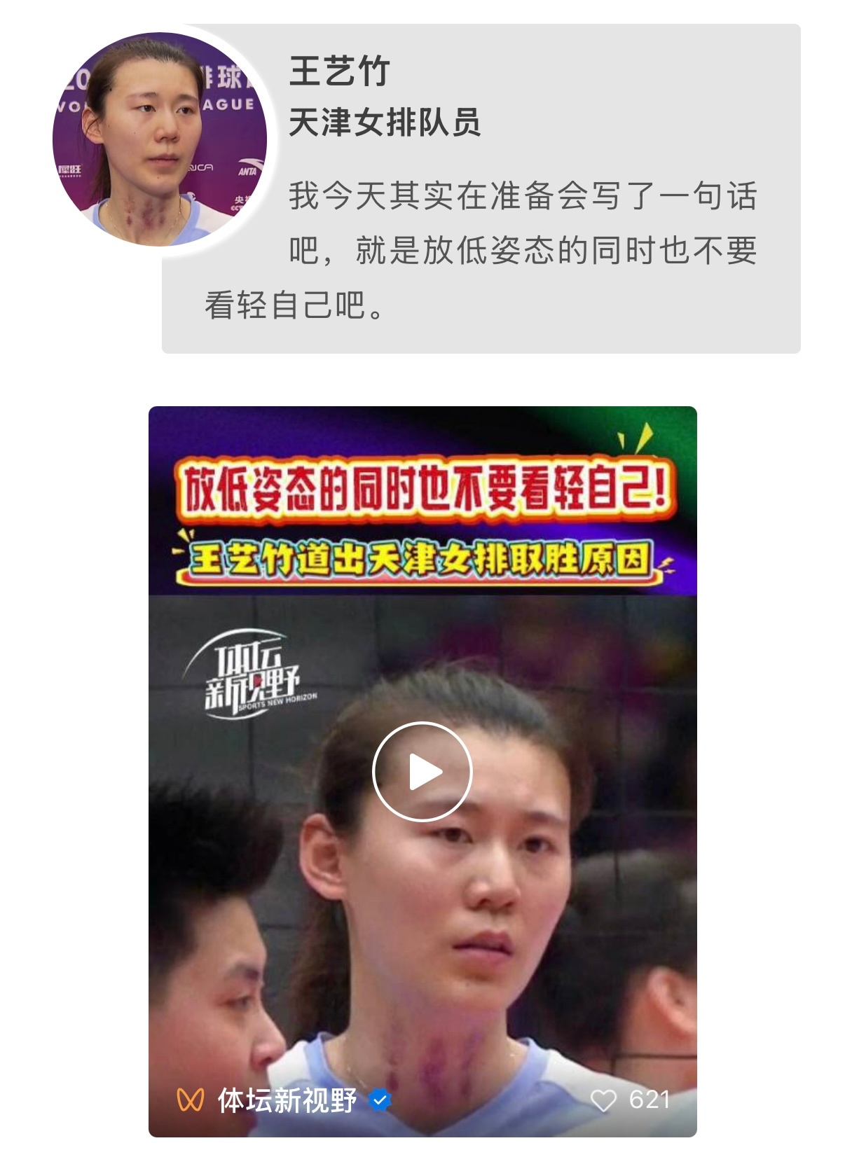 津苏之战前,王艺竹写下这一段话:放低姿态的同时也不要看轻自己吧!天津女排vs江苏
