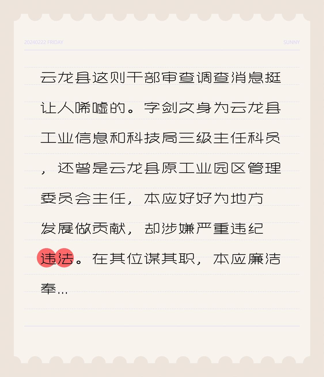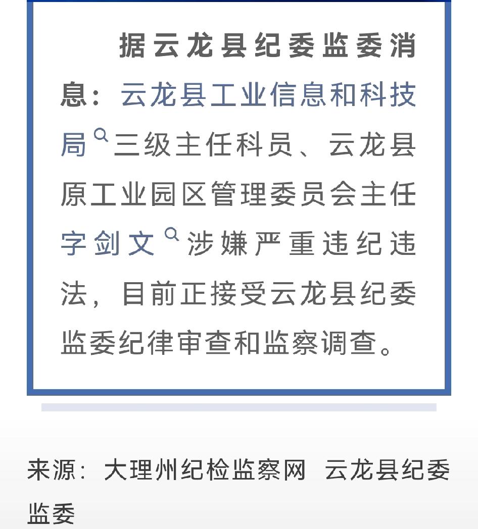 云龙县发布的这则干部审查调查消息,着实令人感慨。 字剑文身为云龙县工业信息和科技局三级主任科员,还曾担任云龙县原工业园区管理委员会主任,本当为地方发展尽心尽力、贡献力量,却涉嫌严重违纪违法。 在其位,谋其政,本应廉洁奉公,为百姓谋福祉,为地方经济发展助力添彩。然而,他却误入歧途,等待他的必将是法律的严惩。 此事也给其他干部敲响了警钟,要时刻坚守廉洁自律的底线,否则一旦伸手,必被惩处。期望相关部门能进一步加大监督力度,让干部队伍保持风清气正。