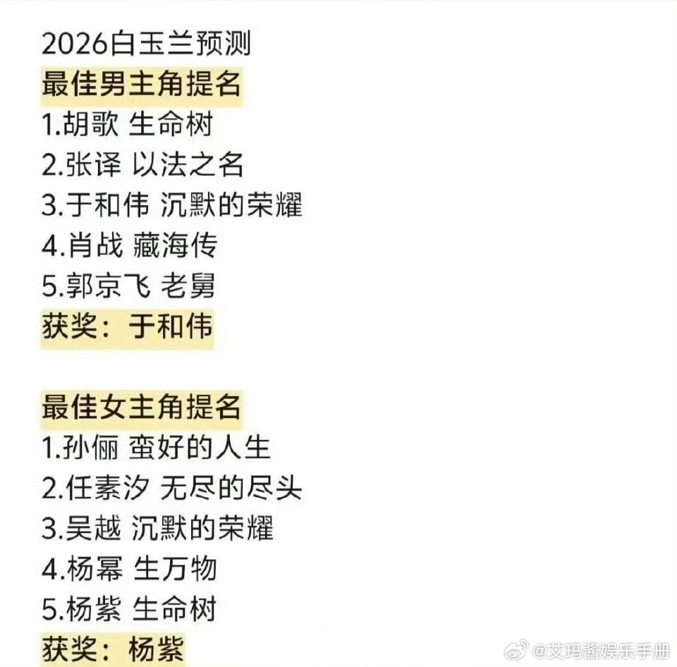 网友预测的白玉兰获奖名单,你认同吗?最佳男主角:于和伟《沉默的荣耀》最佳女主角:杨紫《生命树》最佳男配角:刘佩琦《老舅》最佳女配角:迟蓬《生万物》