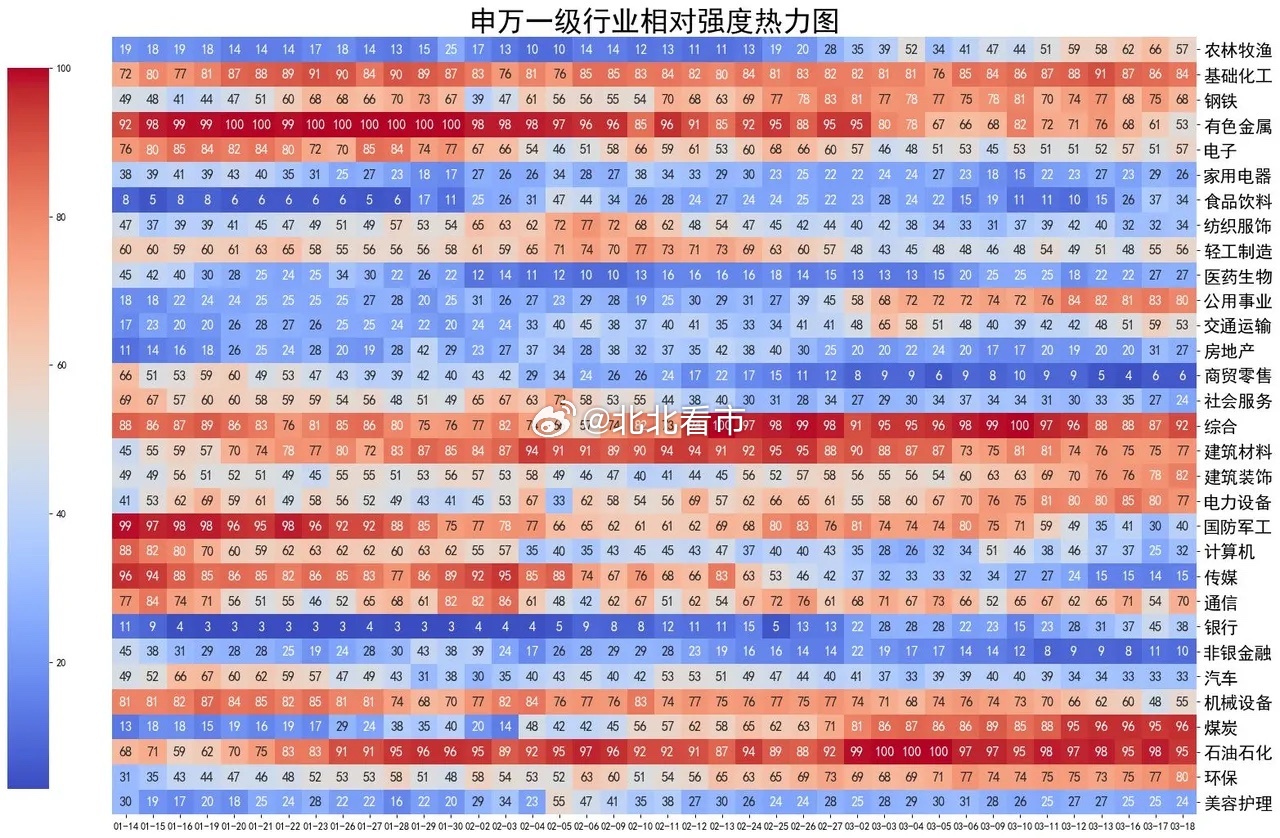 每个小格子代表某个行业在当天的强度,数值介于0-100之间,强度大于50者说明强于市场基准,值得多花一些精力。