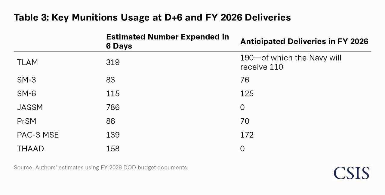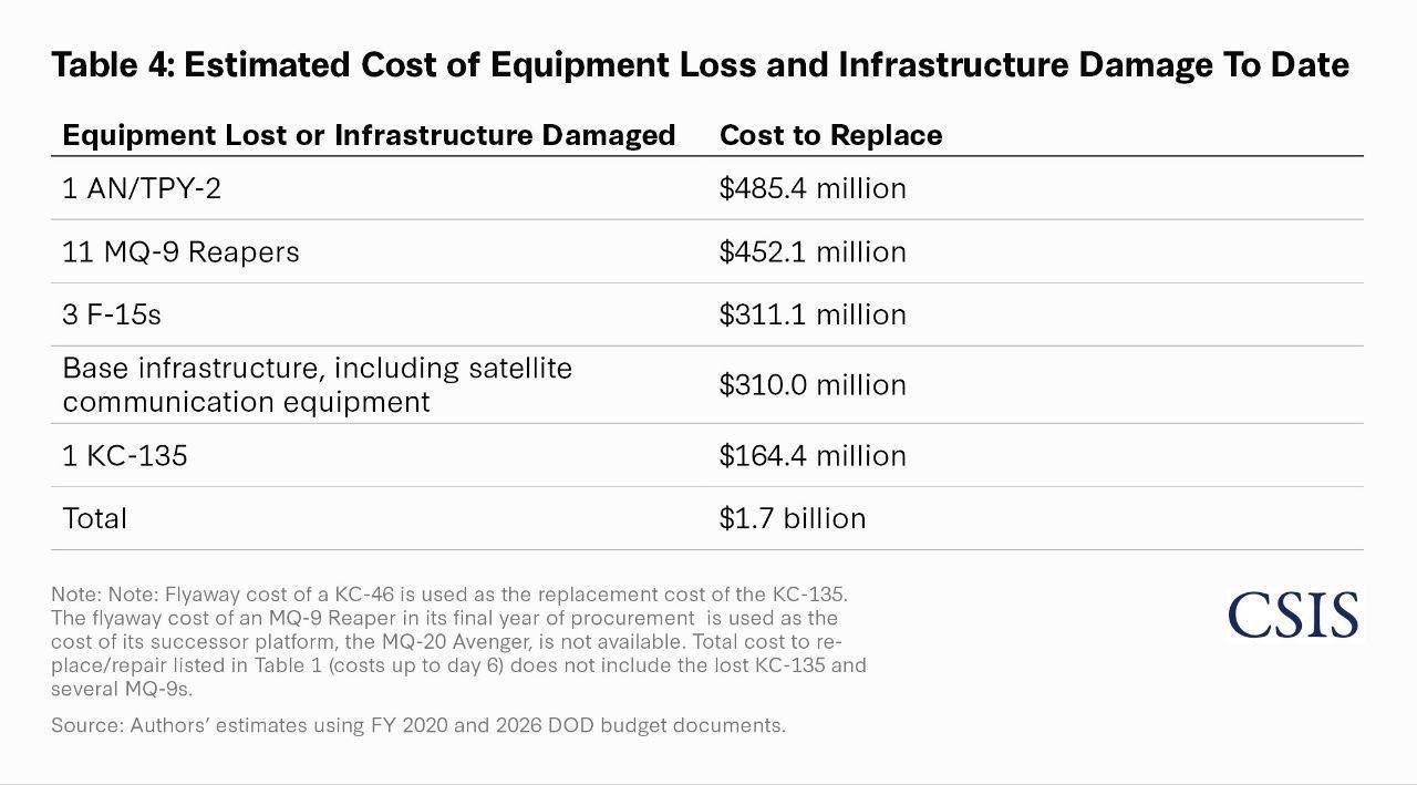 根据美国战略与国际研究中心出具的报告,美军在战争前6天综合成本为113亿美元,包括弹药消耗及损失情况。其中但要消耗包括: TLAM战斧巡航导弹319 枚 JASSM联合空对地防区外导弹786枚 HARM/AARGM反辐射导弹414枚 ATACMS/PrSM战术导弹/精确打击导弹86 APKWS制导火箭弹879枚 爱国者PAC-3防空导弹139枚 萨德系统防空导弹158枚 SM-3/2/6防空导弹198枚 而且这次JASSM导弹的使用数量是战斧导弹的两倍。这种导弹可供战术和战略航空兵使用,1架战略轰炸机大约可以携带20枚,可以打击更多目标。 但是美军公布的损失数量有点不大对,里面并没有罗列出萨德的损失情况。而且受伤的KC-135也没有罗列、基地损失以及各种通讯、小型战术雷达的损失也没有。所以这个报告最终是否准确也存疑。