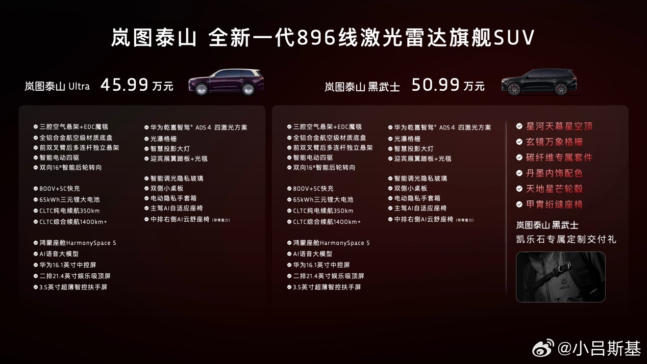 另外我看最近岚图泰山还出了黑武士版,售价50.99万。全黑车身看上去年轻很多,据说还用了很多碳纤维套件,这在大SUV中确实少见。