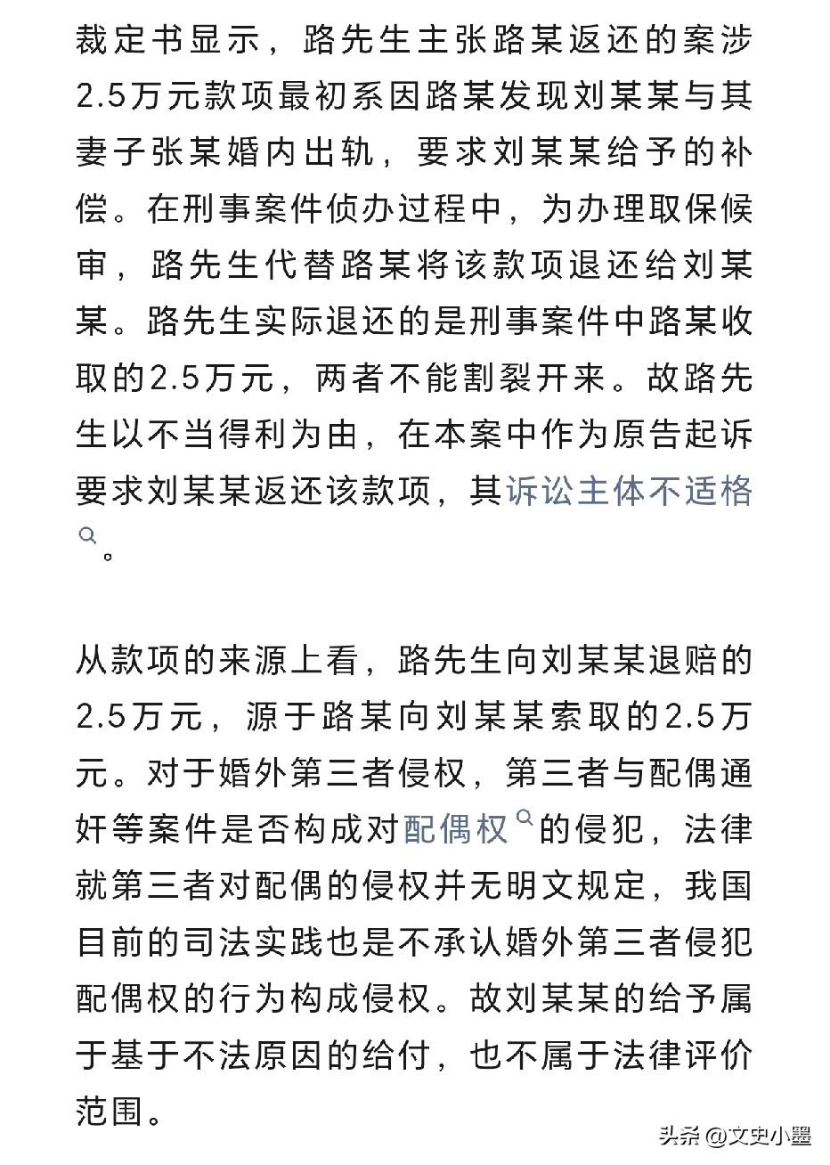 山东淄博捉奸案又有新进展。3月13日,张店区法院驳回了路某父亲要求情夫返还2.5万元的起诉,理由是诉讼主体不适格。路某父亲表示要上诉。 这个案子从2021年拖到现在,路某从有罪到无罪,钱从拿到退再到想要回来,折腾了五年。法院说父亲不是适格原告,钱是儿子收的,父亲退的,两者不能割裂。还说第三者给钱属于不法原因给付,法律不评价。 我觉得这事挺憋屈。路某被戴绿帽子,冲动下收了钱,坐了牢,改判无罪,钱却要不回来。情夫搞别人老婆,主动给钱,转头报警,钱拿了,谅解书写了,一点事没有。法律讲程序,讲主体,可普通人只看到,受了背叛的人,最后什么也没落下。 那2.5万,是路某父亲当年为儿子能取保候审,自己掏腰包退的。现在儿子清白了,这钱就成了糊涂账。法律不保护基于不法原因的给付,可那份谅解,那份被迫的退让,又算什么。 上诉结果如何,还得看。但这件事让人看到,有些伤害,法律真的算不清。
