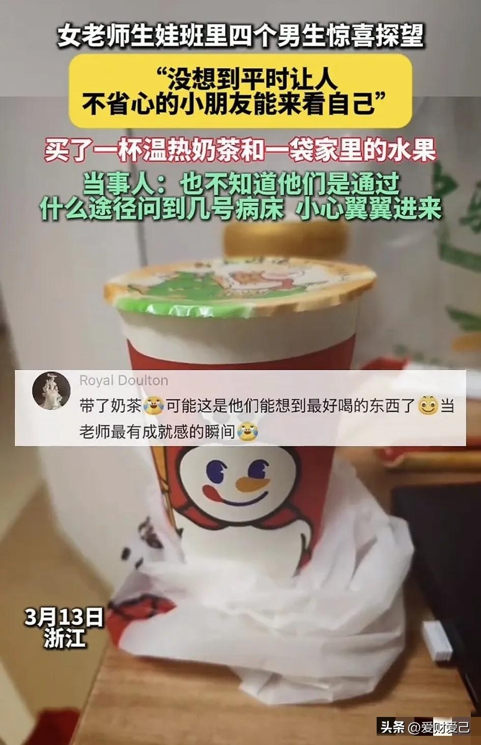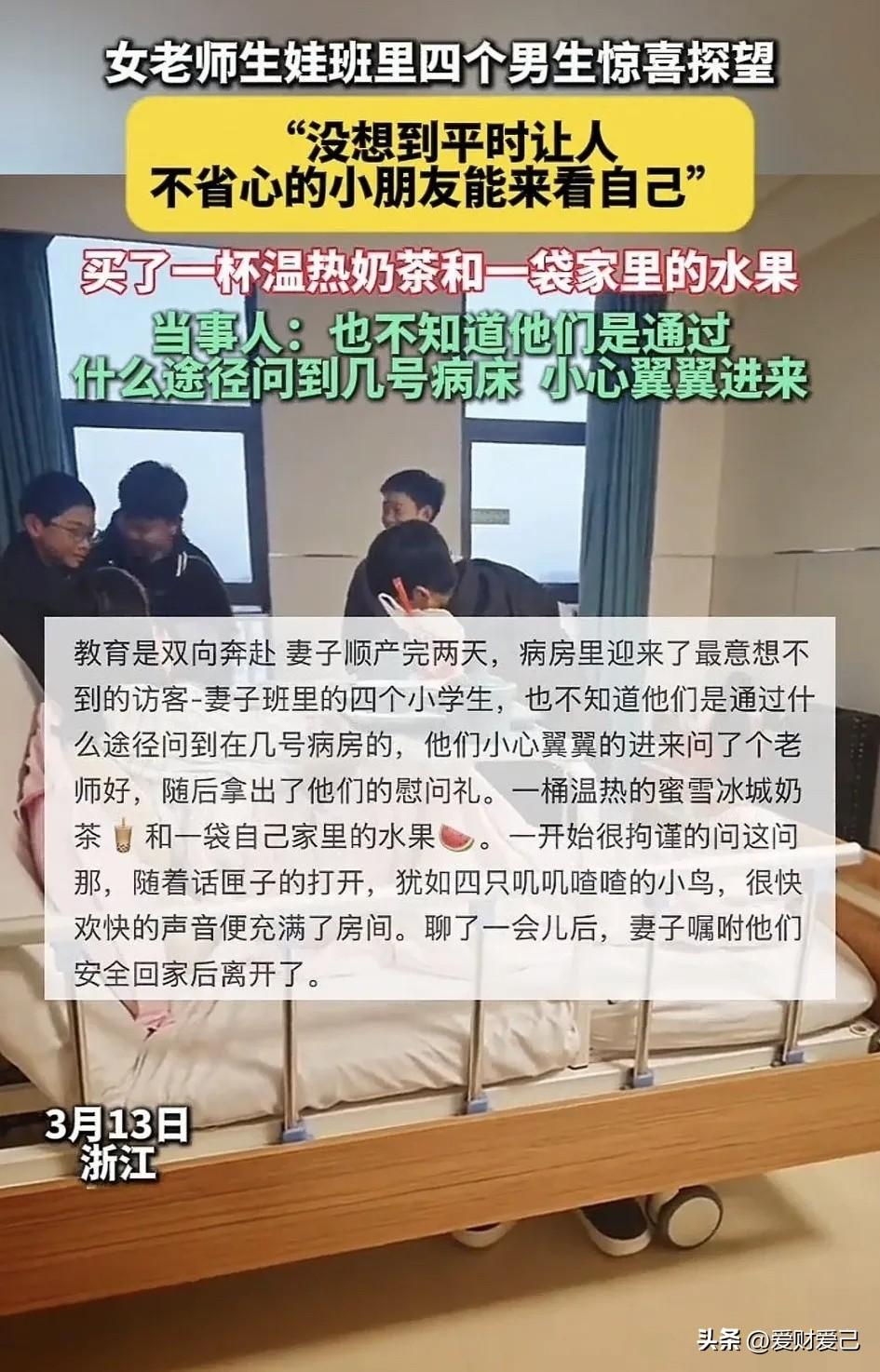 万万没有想到,浙江一位女老师刚生完孩子住院休养,病房里突然闯进了四个熟悉的小身影,让她瞬间红了眼眶。这四个孩子不是班里乖巧听话的优等生,也不是主动帮老师分忧的班干部,恰恰是平日里最让她劳心费神、没少被批评的调皮男生。他们瞒着所有人约好一起来探病,这份突如其来的心意,连老师自己都毫无防备。 老师刚经历生产,身体还处在虚弱恢复期,躺在病床上时不时还要照看新生儿,心思也一直悬在班级里,最放心不下的就是这四个男孩。她甚至暗自琢磨,自己不在学校,这几个小家伙肯定又要上课说话、课间打闹,代课老师估计要被他们折腾得头疼。 等自己出院回去,还得耐着性子好好整顿纪律,她压根没指望这群平时玩心重、记性差的孩子,会惦记着住院的自己。 这四个男孩在班里的模样,熟悉小学课堂的人都能脑补出画面,上课铃响了还坐不住,要么偷偷和同桌传纸条,要么趁老师转身写板书就小声搭话。 下课铃一响就冲出去疯跑,追逐打闹是常态,偶尔还会因为小矛盾闹得同学来告状。作业更是经常拖拉,要么漏写题目,要么字迹潦草,每次批改作业,老师都要对着他们的本子多费好几遍功夫。 老师挺着大肚子上课的那段日子,没少因为他们停下讲课,轻声提醒、严肃批评都用过,有时候气得太阳穴突突跳。看着他们一脸不服气又不敢顶嘴的样子,只能压下火气慢慢引导,心里盼着他们能早点懂事。临放假前,老师还特意把四个孩子叫到身边,反复叮嘱他们要乖乖听代课老师的话,上课守纪律、按时完成作业。 当时几个男孩低着头含糊答应,眼神飘乎乎的,老师还以为他们压根没把这话放在心上,转头就会抛到脑后。毕竟以往这样的叮嘱,他们听过太多次,老师早已习惯了他们表面应付、转头就忘的模样。可谁也没料到,这群看似没心没肺的调皮鬼,把老师的话记在了心里,更把老师住院的事放在了心上。 几个孩子为了这次探病,私下里谋划了好几天,反复商量探望的时间和细节,生怕出现差错。他们怕一大早过来打扰老师休息,又怕放学太晚医院不让进,特意挑了下午自习课的空档。小心翼翼跟代课老师请假,还统一约定不能大声喧哗,绝对不能吵到刚出生的小宝宝。 他们没有买贵重的礼品,只是用攒了很久的零花钱凑钱买了温热的奶茶和新鲜水果,心意十足。有的孩子还从家里摘了自家种的果子,洗得干干净净装在袋子里,一路攥在手里生怕弄皱弄脏。推开病房门的时候,四个男孩一改往日咋咋呼呼的模样,踮着脚尖轻手轻脚走进来,格外乖巧。 嗓门压得极低,连走路都放轻了脚步,平时爱闹腾的性子收敛得干干净净,半点没有往日的顽劣。一个个脸蛋泛红、眼神拘谨,你推我搡地不好意思先开口,生怕惊扰了病床上的老师和旁边熟睡的婴儿。他们站在病床边,乖乖地汇报着班里的近况,说自己最近没闯祸,作业也尽量按时交。 还一遍遍说着让老师好好养身体,别操心班里的事,语气真诚又稚嫩,满是对老师的牵挂。老师看着眼前这四个既熟悉又陌生的小家伙,心里百感交集,过往的无奈和操心瞬间消散。平日里那些鸡飞狗跳的瞬间、恨铁不成钢的无奈,在这一刻全都烟消云散,只剩下满满的暖意和动容。 她忽然意识到,孩子的心思从来都单纯直白,不会用华丽的语言表达,却把真心藏在行动里。他们或许总是用调皮捣蛋的方式吸引关注,可心里清清楚楚记得老师的付出和叮嘱。更记得在老师需要的时候,用最朴素的举动,送上最真挚的牵挂与关心。 短短十几分钟的探望,孩子们全程安安静静,全程守规矩,没有一丝往日的调皮捣蛋。离开时还轻轻带上病房门,生怕漏出风声吵醒老师和婴儿,反复叮嘱老师别挂念班级。老师望着他们小跑离开的背影,心里的柔软被彻底触动,当老师的辛苦疲惫都变得格外值得。 其实很多时候,我们总习惯用成绩、用乖巧与否去定义孩子,却忽略了他们外表下的赤诚真心。他们或许不是最优秀的学生,却懂得感恩与牵挂,这份纯粹情谊格外动人。看完这个故事,你有没有被这群调皮小子暖到?你身边有没有过这样反差满满的暖心小事? 其实很多时候,我们总习惯用成绩、用乖巧与否去定义孩子,却忽略了那些看似调皮的外表下,藏着最赤诚的真心。 他们或许不是最优秀的学生,却懂得感恩与牵挂,这样的温暖瞬间,也让大家看到了师生之间最纯粹的情谊。看完这个故事,你有没有被这群调皮小子暖到?你身边有没有过这样反差满满的暖心小事?