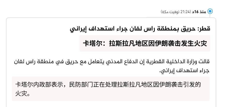 🔻卡塔尔内政部表示:拉斯拉凡地区因伊朗袭击发生火灾。🔻拉斯拉凡就是拉斯拉凡炼油厂的所在地。🔻与此同时,沙特国防部称:还在拦截多地来袭的无人机,利雅得等地也继续拉响防空警报。🔻via aljanews 新闻网伊朗发射集束弹头导弹袭击以色列伊朗石油工业设施遭袭海外新鲜事中东现场直击