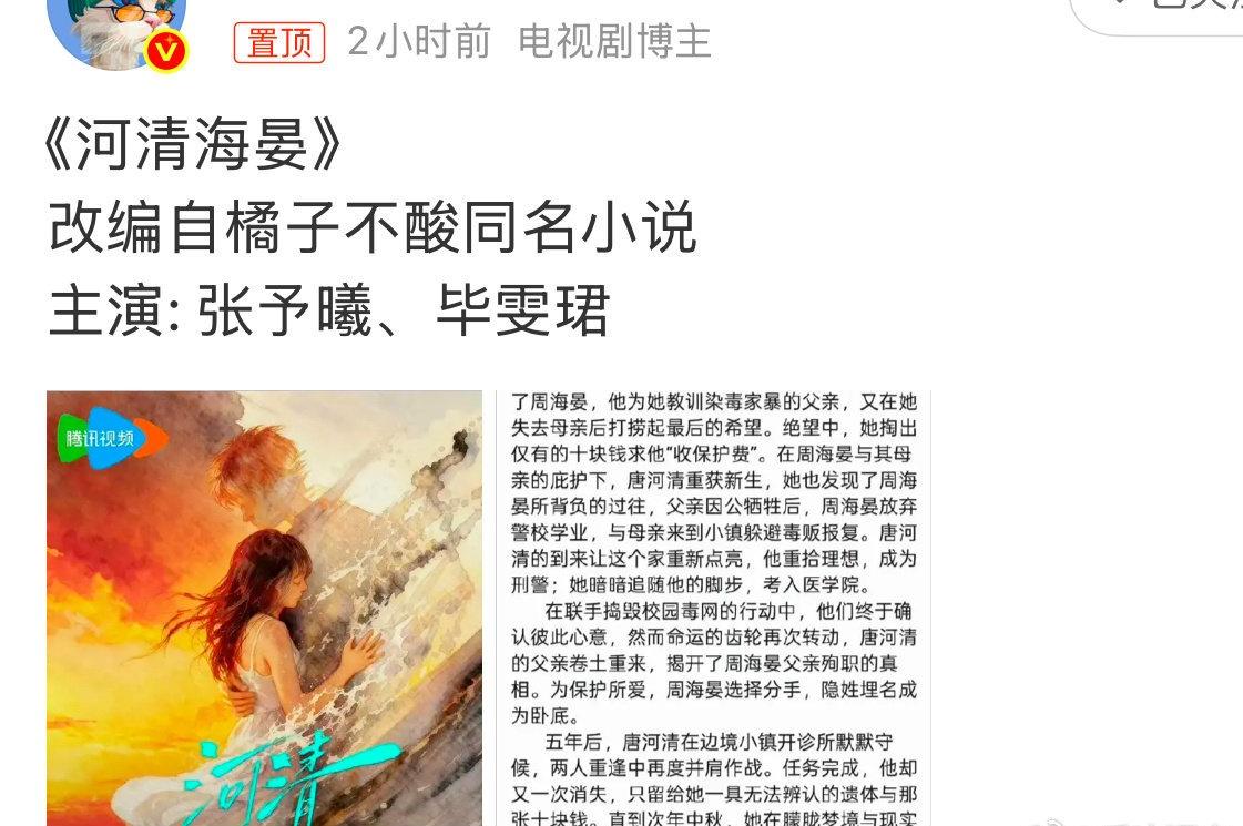 🍉《河清海晏》影视化 主演:张予曦、毕雯珺 无予伦毕二搭这就来了吗[哆啦A梦吃惊][哆啦A梦吃惊]