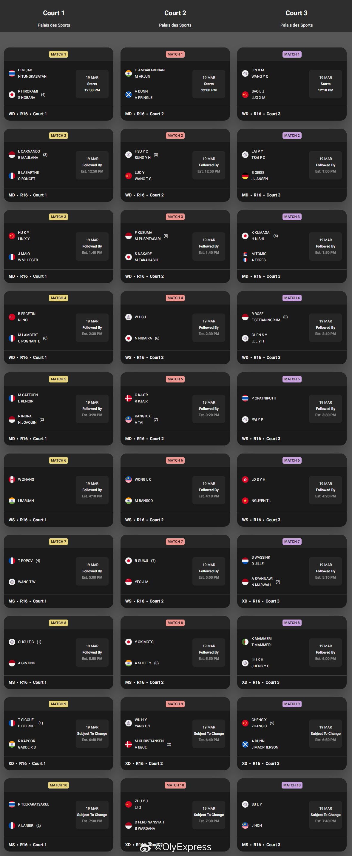 【奥尔良羽毛球大师赛次轮赛程对阵】2026年奥尔良大师赛羽联超级赛 3月19日法国奥尔良,2026世界羽联超级300奥尔良大师赛将进行第二轮,比赛将于北京时间19时开始,国羽赛程对阵如下,完全赛程对阵见图:男单:胡哲安vs田中涌士(日本)董天尧vs王柏崴(中国台北)王正行vs约翰内森(丹麦)男双:胡珂源/林祥毅vs麦奥/维尔格(法国)女双:罗意/王汀戈vs许雅晴/宋祐媗(中国台北)鲍骊婧/罗徐敏vs林筱闵/汪郁乔(中国台北)混双:程星/张驰vs邓恩/迈克菲尔森(苏格兰)朱一珺/李茜vs费迪南斯亚赫/瓦达纳(印尼)