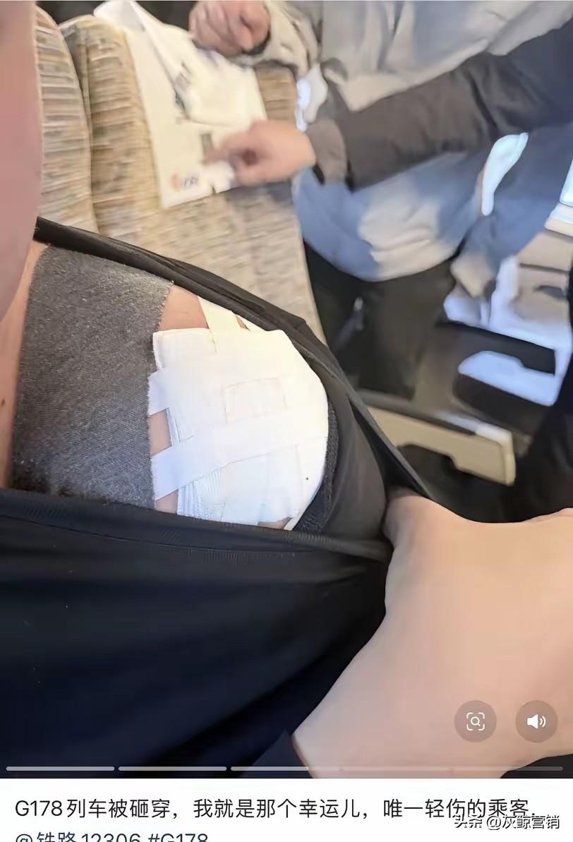G178列车被异物击穿顶部,有乘客受伤,乘客用手机拍下的。 高铁速度快,很小的异