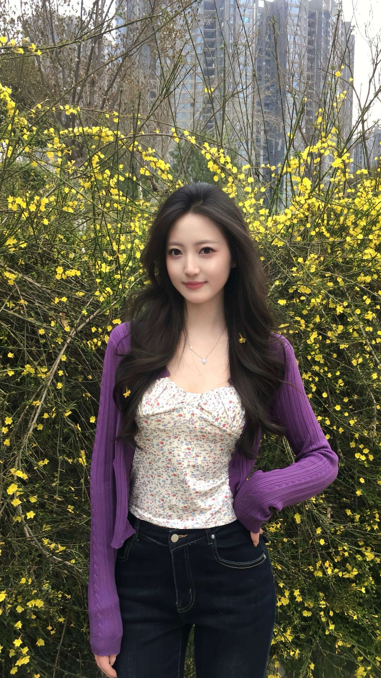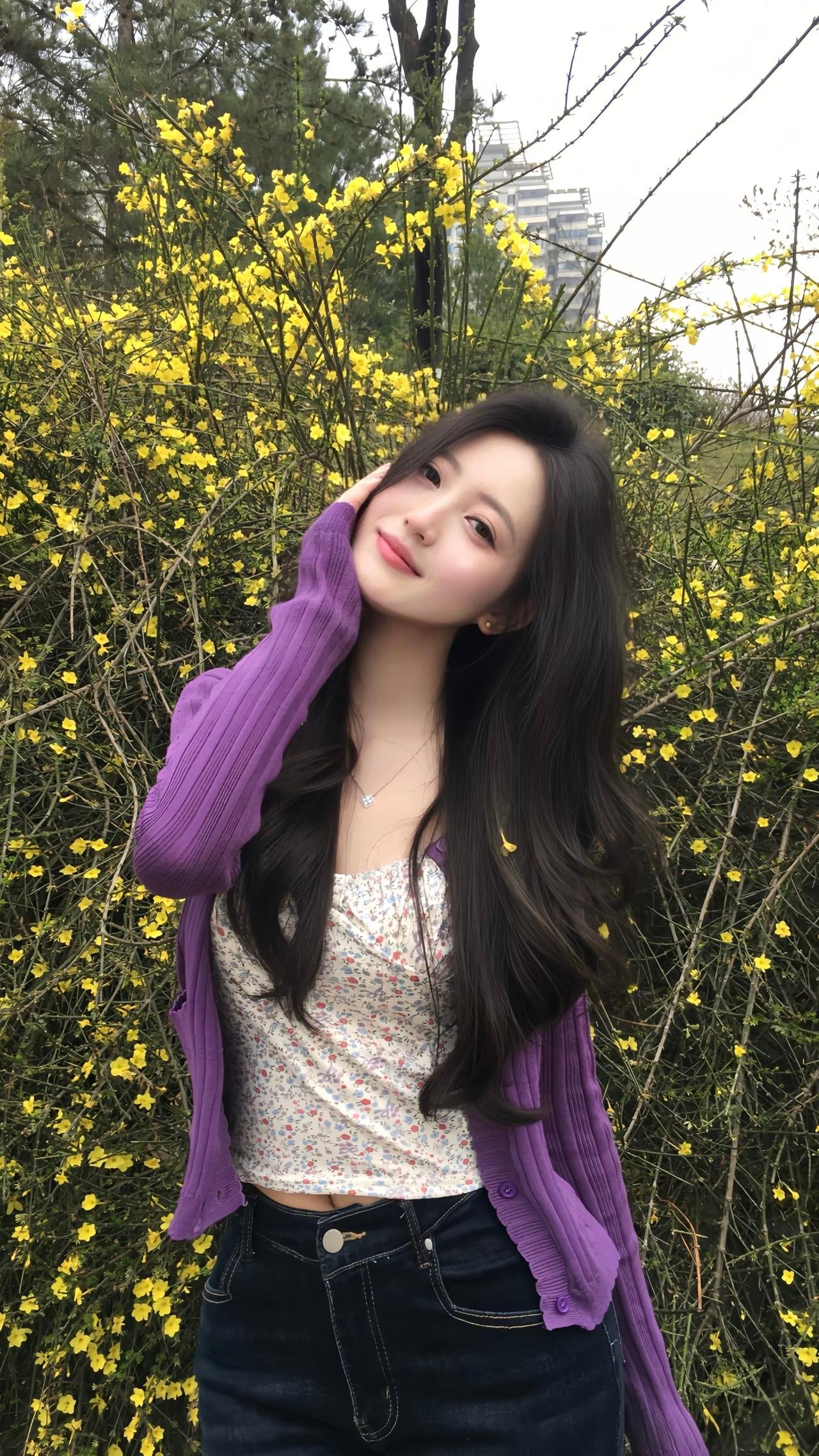 她在花丛中开心地笑着。