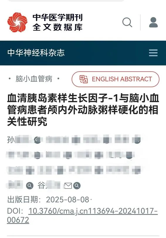 3月18日,针对孙同学的科研能力,封面新闻检索学术资料发现,孙同学曾以第一作者身份,在《中华神经科杂志》发表题为《血清胰岛素样生长因子-1与脑小血管病患者颅内外动脉粥样硬化的相关性研究》的文章,而其导师谷某某排名末尾。