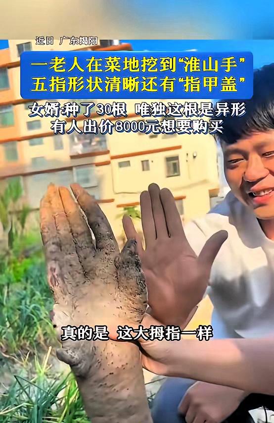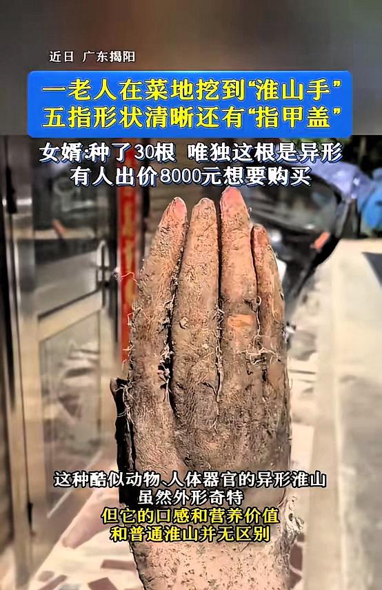 活久见!广东揭阳,一老人在自家菜地里挖淮山,不料,挖着挖着突然看见地里出现“一只手”,这把老人吓得不轻,等她冷静后仔细查看,才发现这其实是酷似人手的淮山,不少人都想出高价买下,但都被拒绝了!网友:稀罕物啊! 这事发生在揭阳揭西县马头村,3月14日那天,59岁的刘阿姨像往常一样去自家菜地收淮山。她种了三十来根淮山,前面挖出来的都规规矩矩、直直溜溜,挖到最后一根时,锄头刚拨开土,一截白花花、带着分叉的东西露了出来,越看越像人的手,连指节、指尖都清清楚楚。刘阿姨当场腿都软了,赶紧喊家人过来壮胆,一家人围着慢慢清土,越挖越吃惊——这哪是人手,分明是一根长得跟人手一模一样的淮山! 更绝的是细节:五指分明,大拇指、四指比例自然,刚挖出来时指尖还有淡淡的粉色,像极了指甲盖,整根将近一米长,掌心还有自然的小凹陷,不仔细看真能吓一跳。刘阿姨种了几十年菜,家人也都是老庄稼人,谁都没见过这么逼真的异形淮山。 后来女婿把视频发到网上,一下子就火了。不少人慕名找上门,有人直接开价8000块想买走,都被一家人婉拒了。他们说,这是大自然给的小惊喜,不是什么值钱的宝贝,更想做成标本留着,当个稀罕玩意儿纪念,比卖钱有意思多了。 有网友说:这淮山是成精了吧,长得跟真手一样,换我我也吓懵! 还有网友说:8000块都不卖,这家人实在,不贪小便宜,留着比卖了有意义。 还有网友说:大自然太神奇了,植物长成人形真不多见,这运气也太好了! 地里长出奇形怪状的作物,本就是生长巧合,一家人不炒作、不漫天要价,只想留着当个乐子,这份朴实比什么都珍贵。比起一夜暴富的念想,守住生活里的小惊喜、小趣味,才更踏实、更长久。