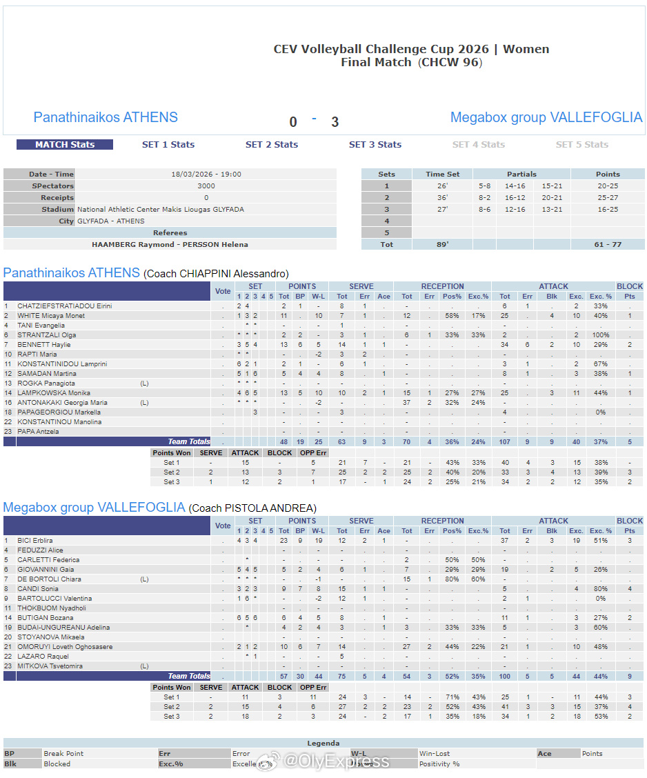 【女排欧挑杯瓦莱福里亚创造历史首登顶】国际排坛战报速递 3月18日雅典,女排欧挑杯落幕。意大利瓦莱福里亚客场3-0(25-20/27-25/25-16)完胜希腊帕纳辛纳科斯,两回合双杀对手,首次参加欧战即夺冠。MVP比希23分、奥莫鲁伊10分,拉姆科夫斯基和本内特各13分、怀特11分。