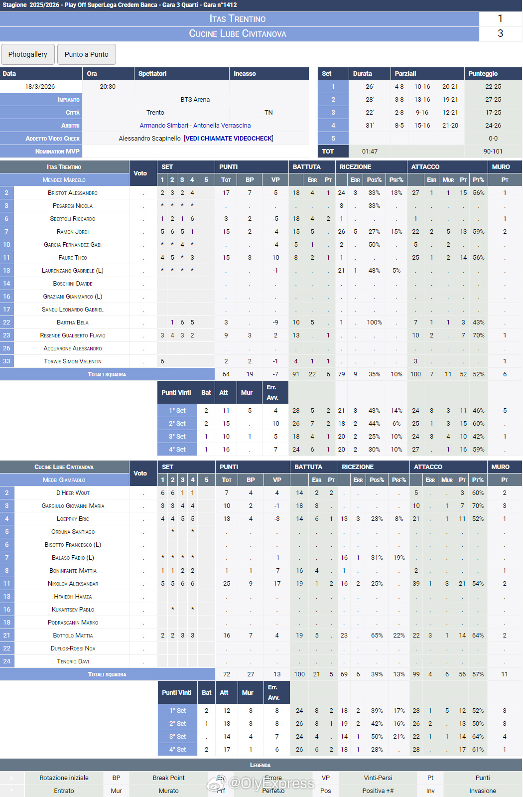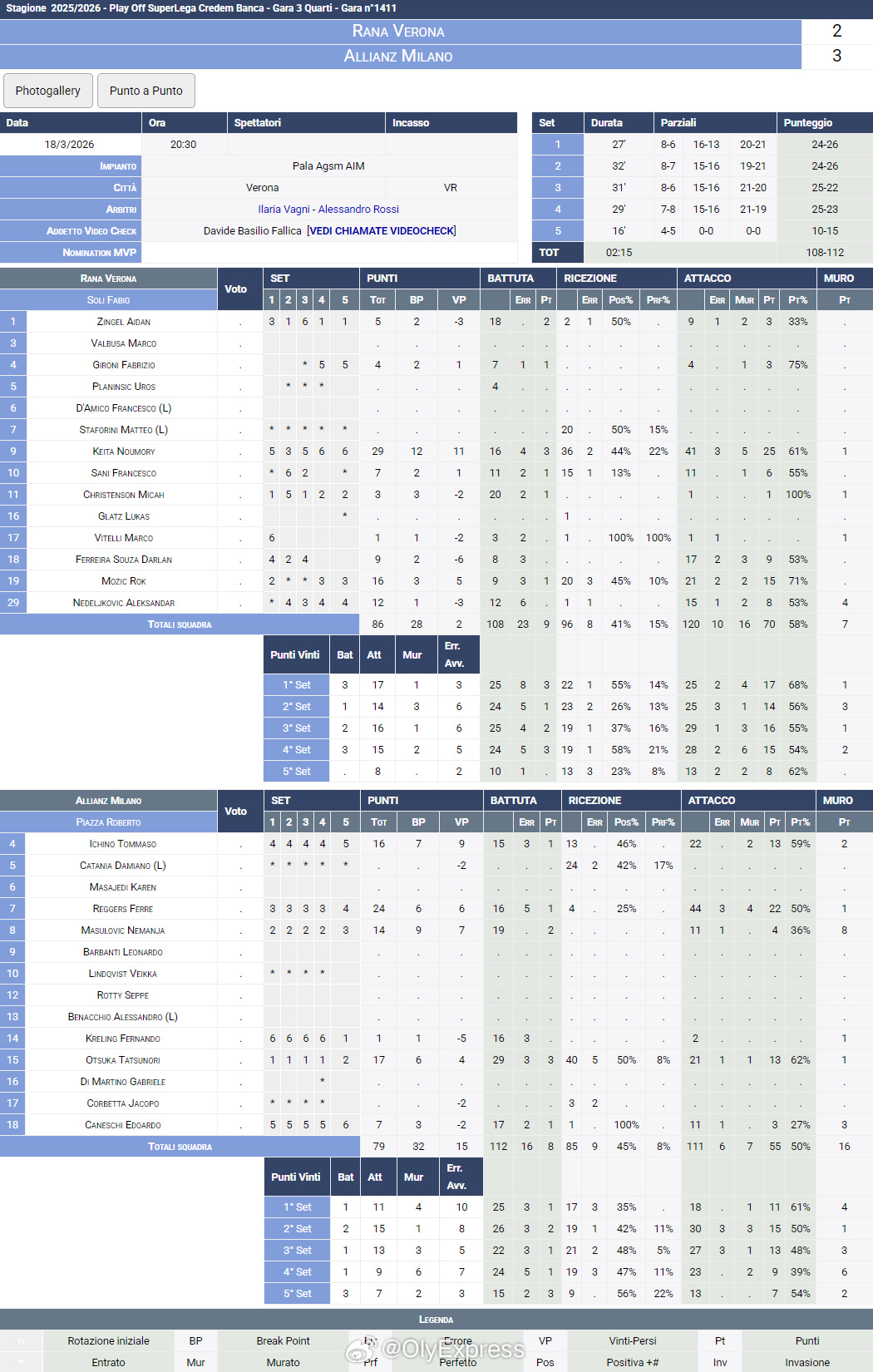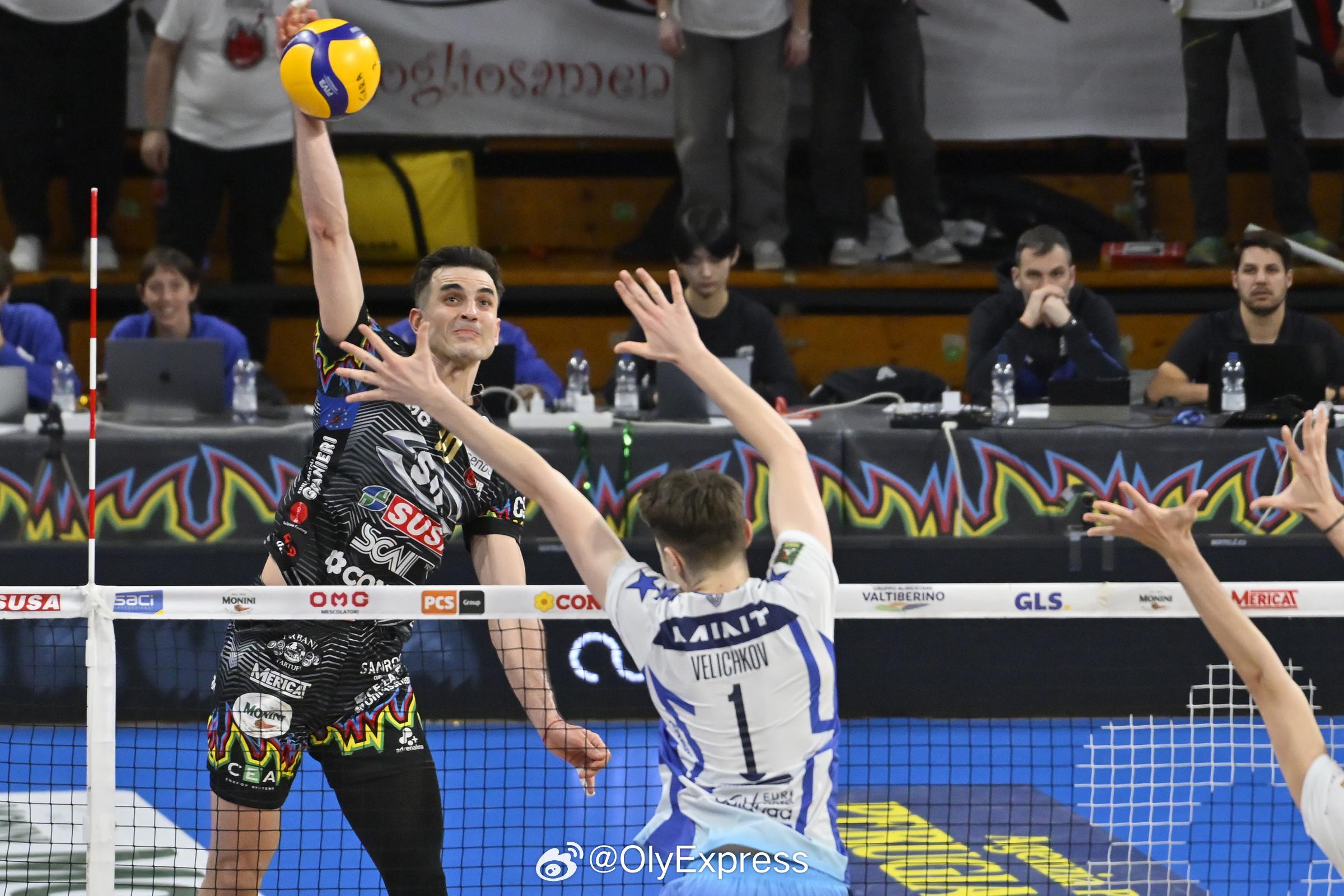 【意超男排佩鲁贾鲁贝三连胜率先晋级四强】国际排坛战报速递 3月18日,意超男排1/4决赛第三回合,佩鲁贾和奇维塔诺瓦再胜对手,以总比分3-0率先晋级四强,维罗纳和米兰则将进入第四场较量。佩鲁贾主场3-0(25-19/25-23/25-20)零封蒙扎,本塔拉和普罗特尼茨基各13分、鲁索12分、塞曼纽克10分,罗尔斯15分、弗雷西奥11分;奇维塔诺瓦客场3-1(25-22/25-27/25-17/26-24)力克特伦蒂诺,MVP尼科洛夫25分、波托洛16分、洛普基13分、加久洛10分,布里斯托特17分、弗雷和拉蒙各15分;维罗纳主场2-3(24-26/24-26/25-22/25-23/10-15)惜败米兰,总比分2-1领先。凯塔29分、莫兹奇16分、內德尔科维奇12分,雷杰斯24分、MVP大塚达宣17分、伊奇诺16分、马苏洛维奇14分。