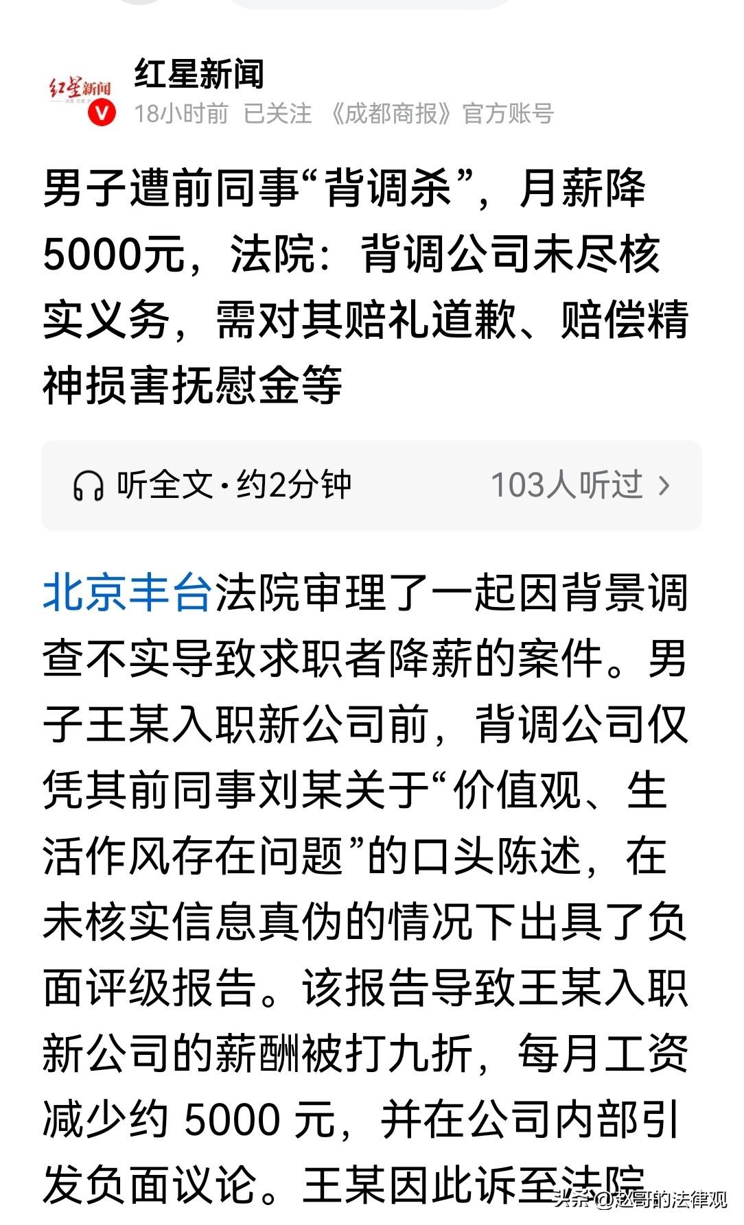 造谣动动嘴,辟谣跑断腿!北京,男子跳槽新单位,背调公司去他原单位做背景调查,万万没想到,前同事造谣说他有作风问题。背调公司没核实,按着原话出具了背调报告,新公司立马把男子工资下调5000元,还被人背后议论,男子气炸,以公司侵犯他的名誉权为由,起诉到法院,法院判了! 王先生,喜滋滋等着去新公司上班,结果一份背景调查报告,让他即将到手的月薪直接少了5000块。 更憋屈的是,说他坏话的那个人,是他以前关系还不错的前同事。 王先生本来已经通过了新公司的面试,双方谈好了工资待遇。 就等着走完最后一道流程,然后入职,谁知道这节骨眼上出了大事! 背调公司接受委托后,联系了王某之前公司的同事,想了解一下他过往的工作情况。 他们找到了刘某,电话里聊了聊。 刘某不知道是咋想的,虽然他之前和王某关系还很不错。 这次不知出于什么目的,跟背调人员说,王某这人“价值观有点问题,生活作风也不太好”。 就这么两句没头没尾的话,背调公司也没多问具体什么事,有没有证据? 直接当成了有效信息,写进了给新公司的调查报告里。 报告里还给了个评级,叫“黄灯”,意思就是这人有点风险,你们看着办。 新公司拿到报告一看,心里有数了。 本来都谈好了,现在突然冒出个“生活作风”问题。 可这岗位又急着用人,招都招了,怎么办?公司最后想了个折中的办法:人我们要,但薪资得重新谈。 原来谈好的月薪,直接打了个九折。 王某算了一下,这一打折,每个月少拿将近5000块。 一年下来就是五六万,这谁受得了? 但这还不是最难受的。 入职之后,王某慢慢发现不对劲。 有同事看他的眼神怪怪的,偶尔还能听见有人在背后嘀咕。 后来他才琢磨过来,那份背调报告,公司里知道的人不止一两个。 那个生活作风有问题的说法,也不知道怎么就在小范围内传开了。 他百口莫辩,那种感觉就像身上被贴了个标签,怎么撕都撕不下来。 王某越想越气,我凭本事找的工作,凭什么让人这么糟践? 他去找那个前同事刘某对质,刘某倒是说了实话:我当时就那么随口一说,谁知道他们当真了。 但随口一说也是说,问题是事实上没这回事,他是造谣,可造成的后果已经收不回来了。 王某咽不下这口气,一纸诉状把背调公司告上了法院。 你们做背调,不该核实信息的真假吗? 别人说什么你们就写什么,连问都不问一句,这跟传谣有什么区别? 就因为你们这份不负责任的报告,我工资被降了,名声也坏了,这损失你们得认。 法官审理后认为,事情的关键,不在刘某说什么,而在于背调公司怎么处理这个信息。 背调背调,核心就是个调字,你得去调查、去核实。 刘某说王某有问题,那你们有没有问问他有什么问题? 有没有找其他人交叉印证一下? 有没有让刘某拿出点依据来? 什么都没有,就凭一通电话里的两句话,直接给人家定了个“黄灯”评级? 最后法院认定:背调公司不能只当个传声筒,没尽到核实义务,就把这些负面评价往外发。 导致王某入职受影响、薪资被降、还在新公司里被人议论,这已经侵犯了王某的名誉权。 判决结果,背调公司向王某赔礼道歉,赔偿精神损害抚慰金,恢复名誉、消除影响。 案子判了,钱赔了,道歉也道了。 但对王某来说,有些东西可能回不来了。 那个每个月少拿5000块的合同他已经签了。 公司里那些若有若无的眼光和议论,也不是一句道歉就能抹掉的。 这事传开之后,不少打工人都看得后背发凉。 谁还没几个前同事?万一哪天跳槽,碰上背调,人家在电话里来一句:这人不太行。 自己连解释的机会都没有,工作就黄了。 更气人的是,背调公司收着钱,却连最基本的核实都不做,把别人的前途当儿戏。 《民法典》第一千零二十四条:民事主体享有名誉权。任何组织或者个人不得以侮辱、诽谤等方式侵害他人的名誉权。 名誉是对民事主体的品德、声望、才能、信用等的社会评价。 前同事刘某的造谣,属于诽谤,是在用虚假信息损害王先生的名誉。 而背调公司,传话式写入报告提供给新公司,侵犯了王先生的名誉权。 背调公司和刘某的行为,都是法律所不允许的,他们需要为自己的行为,承担相应的法律责任。 正所谓,造谣一张嘴,辟谣跑断腿,跳个槽,也得小心翼翼,生怕被前同事背后下刀子。 虽然法院给了王某公平公正的判决。 可他少拿的工资,和他受到的伤害谁来弥补呢? @赵哥的法律观,欢迎评论区发表您的看法。