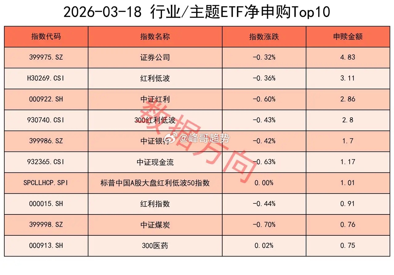 红利低波指数(3.11亿)、中证红利指数(2.86亿)、300红利低波指数(2.8亿)、中证银行指数(1.7亿)、中证现金流指数(1.17亿)、标普中国A股大盘红利低波50指数(1.01亿)、红利指数(0.91亿)、中证煤炭指数(0.76亿),八个红利、高股息指数一起挤入申购榜,显示了资金在特殊时期的避险意识。国新港股通央企红利指数(-2.66亿)进入赎回榜。