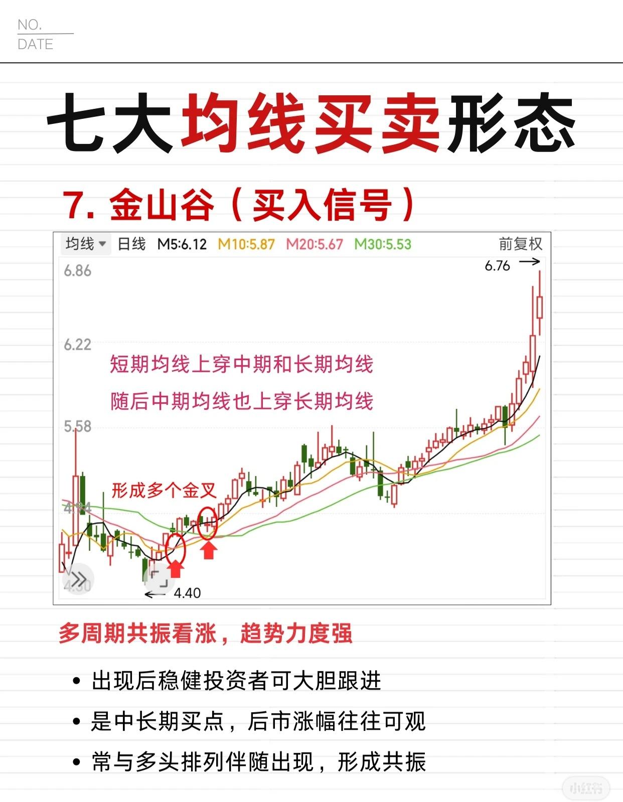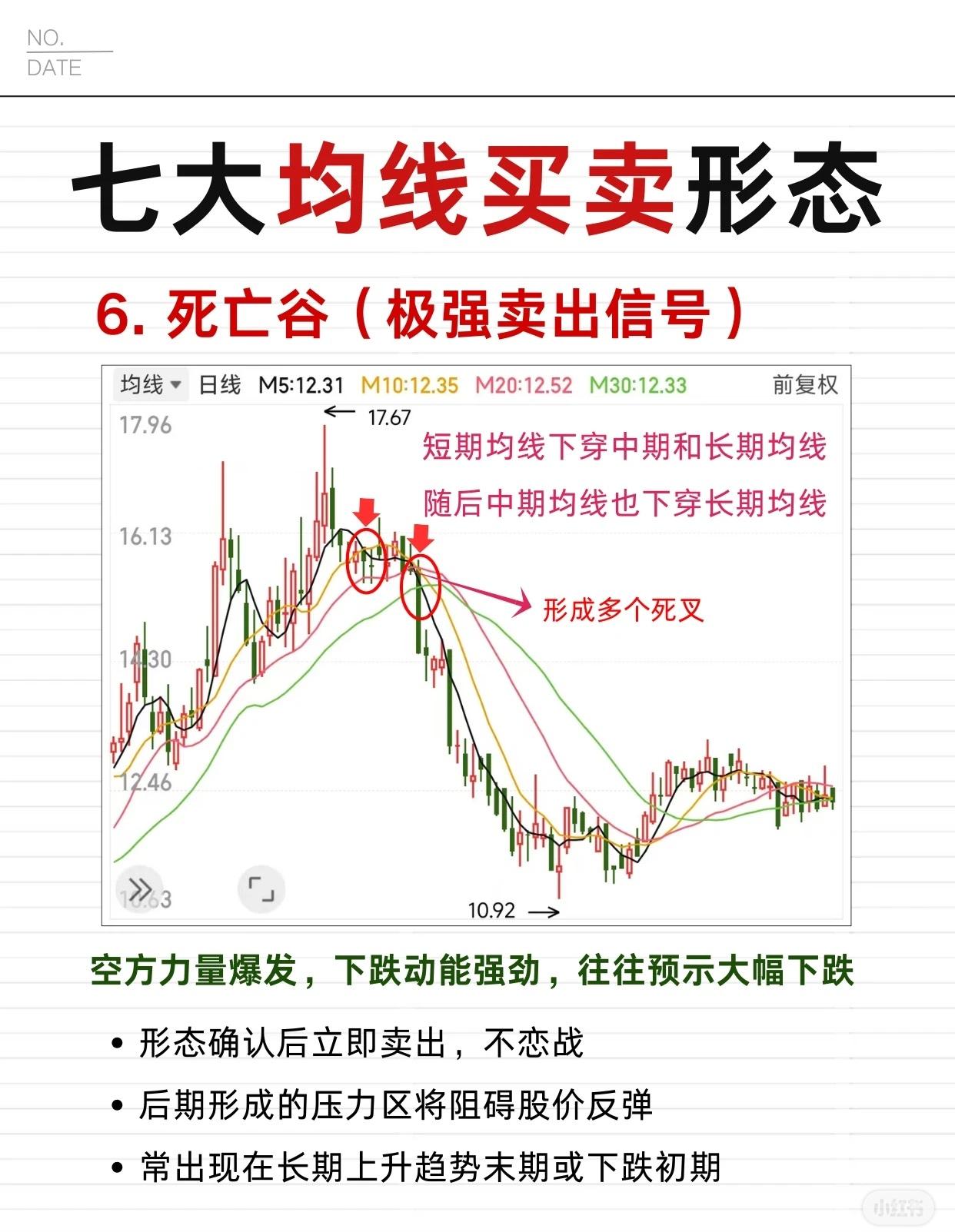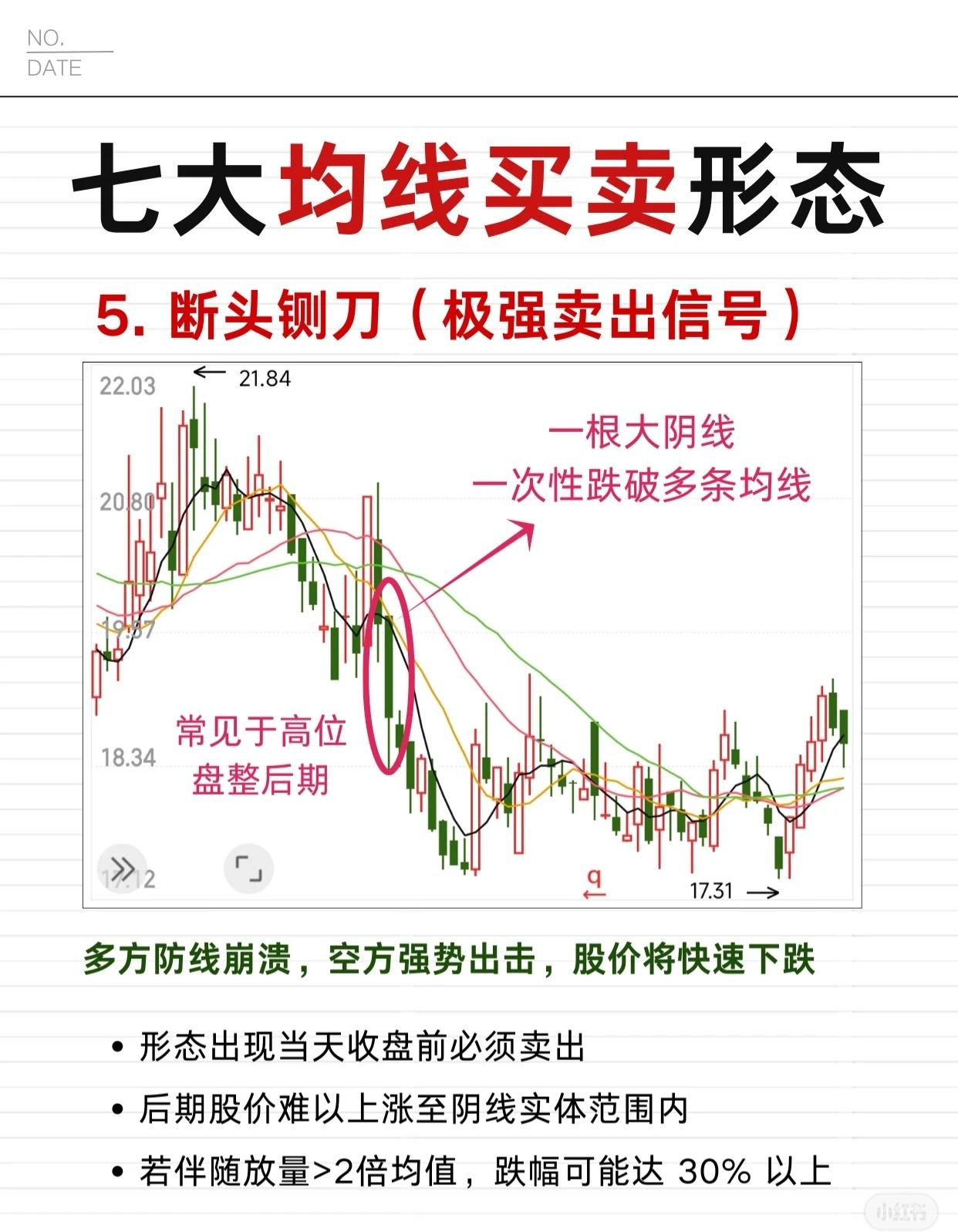 七大均线买卖形态可总结为以下7类,涵盖买入与卖出信号,核心围绕均线排列、交叉及特殊K线组合来判断趋势与操作时机: 一、买入信号 1. 多头排列:短期均线>中期均线,所有均线向上发散,呈明确上升趋势(多方主导)。初期/中期积极做多、可加仓,后期谨慎持股;股价回调至均线附近是买点,预示股价持续上涨。 2. 金叉:MA5上穿中/长期均线,短期趋势转强。级别越大上涨力度越强,初期/中期积极做多、可加仓,后期谨慎持股;股价回调至均线附近是买点,预示股价将上涨。 3. 金山谷:短期均线上穿中期、长期均线,随后中期均线也上穿长期均线(形成多个金叉),多周期共振看涨、趋势力度强。是中长期买点,后市涨幅可观,常与多头排列共振,稳健投资者可大胆跟进。 二、卖出信号 1. 空头排列:短期均线<中期均线,所有均线向下发散,呈明确下降趋势(空方主导)。初期/中期坚决做空或持币观望,后期谨慎做空(防趋势反转);股价反弹至均线附近是极佳卖点,预示股价持续下跌。 2. 死叉:MA5下穿中/长期均线,短期趋势转弱。级别越大杀伤力越强,股价大幅上涨后出现需立即减仓/清仓,中长线投资者周/月K线出现时果断离场,结合成交量放大(>20%均值)确认信号,预示股价将下跌。 3. 断头铡刀:高位盘整后期,一根大阴线一次性跌破多条均线,多方防线崩溃、空方强势出击。形态出现当天收盘前必须卖出,后期股价难涨至阴线实体范围内,若放量>2倍均值,跌幅或达30%以上,预示股价快速下跌。 4. 死亡谷:短期均线下穿中期、长期均线,随后中期均线也下穿长期均线(形成多个死叉),空方力量爆发、下跌动能强劲。形态确认后立即卖出(不恋战),后期形成的压力区阻碍股价反弹,常出现在长期上升趋势末期或下跌初期,预示大幅下跌。 这些形态通过均线方向、交叉关系及K线配合,判断多空力量变化与趋势延续/反转,指导投资者在不同阶段采取做多、做空或观望策略,核心是顺应趋势、把握节奏。