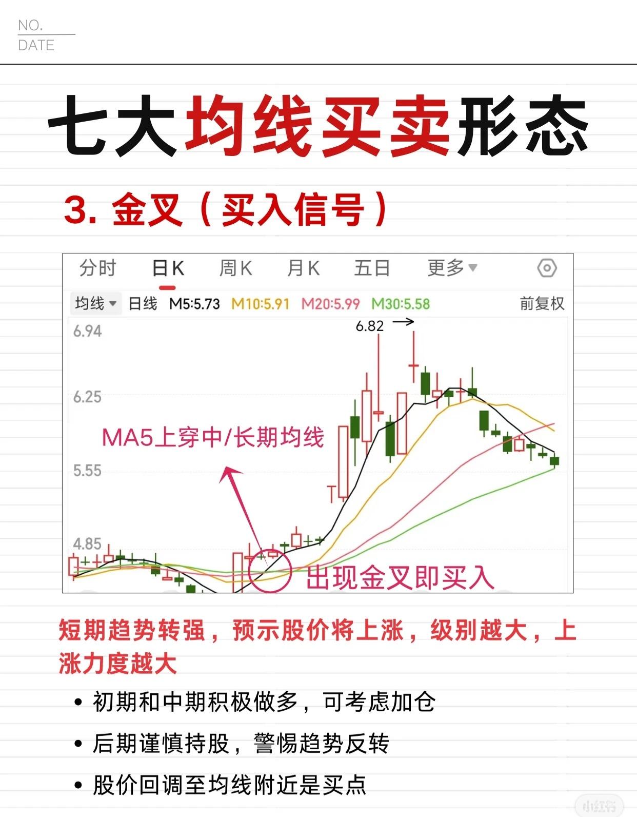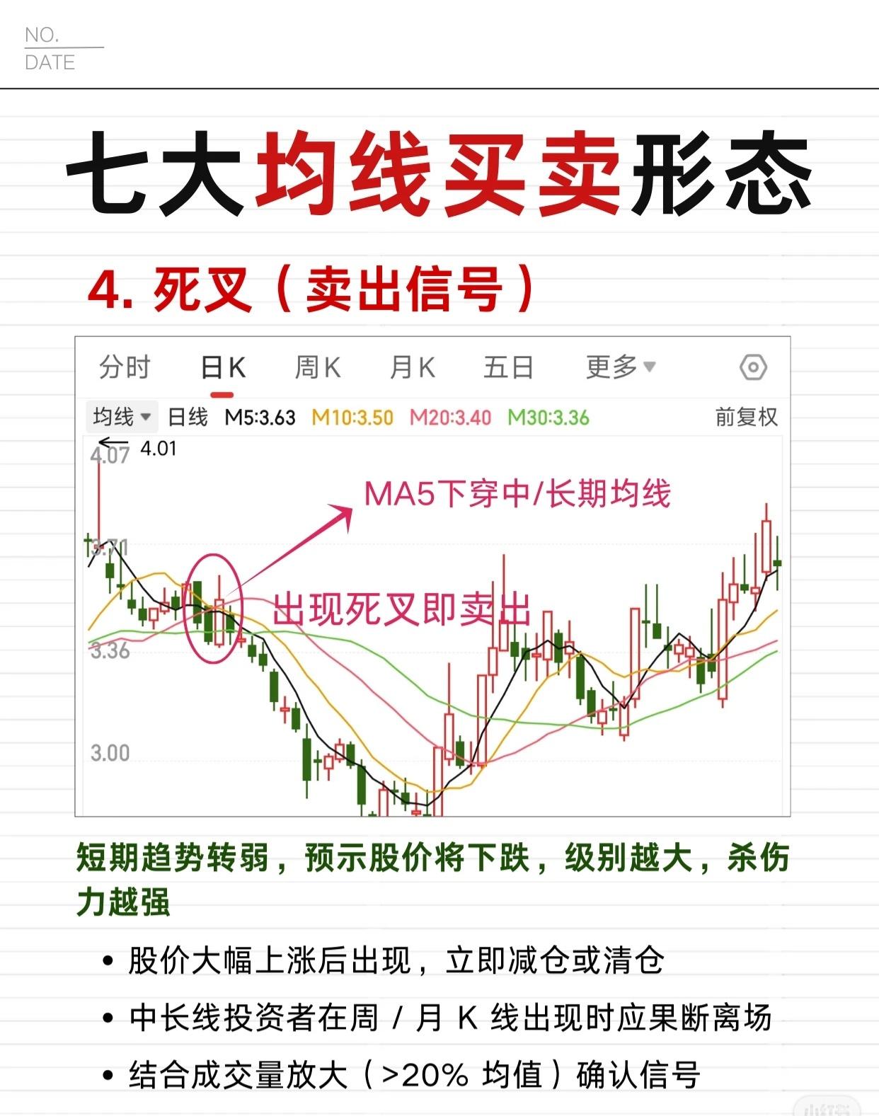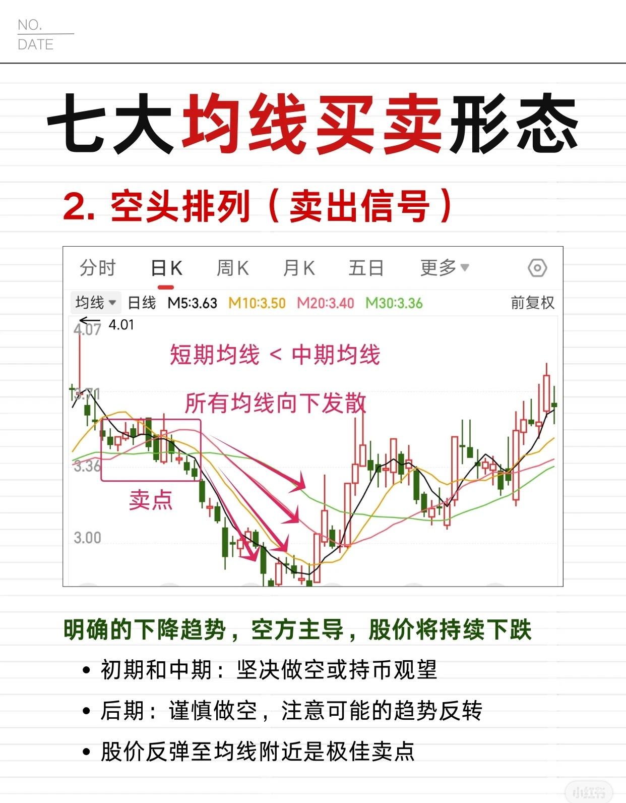七大均线买卖形态可总结为以下7类,涵盖买入与卖出信号,核心围绕均线排列、交叉及特殊K线组合来判断趋势与操作时机: 一、买入信号 1. 多头排列:短期均线>中期均线,所有均线向上发散,呈明确上升趋势(多方主导)。初期/中期积极做多、可加仓,后期谨慎持股;股价回调至均线附近是买点,预示股价持续上涨。 2. 金叉:MA5上穿中/长期均线,短期趋势转强。级别越大上涨力度越强,初期/中期积极做多、可加仓,后期谨慎持股;股价回调至均线附近是买点,预示股价将上涨。 3. 金山谷:短期均线上穿中期、长期均线,随后中期均线也上穿长期均线(形成多个金叉),多周期共振看涨、趋势力度强。是中长期买点,后市涨幅可观,常与多头排列共振,稳健投资者可大胆跟进。 二、卖出信号 1. 空头排列:短期均线<中期均线,所有均线向下发散,呈明确下降趋势(空方主导)。初期/中期坚决做空或持币观望,后期谨慎做空(防趋势反转);股价反弹至均线附近是极佳卖点,预示股价持续下跌。 2. 死叉:MA5下穿中/长期均线,短期趋势转弱。级别越大杀伤力越强,股价大幅上涨后出现需立即减仓/清仓,中长线投资者周/月K线出现时果断离场,结合成交量放大(>20%均值)确认信号,预示股价将下跌。 3. 断头铡刀:高位盘整后期,一根大阴线一次性跌破多条均线,多方防线崩溃、空方强势出击。形态出现当天收盘前必须卖出,后期股价难涨至阴线实体范围内,若放量>2倍均值,跌幅或达30%以上,预示股价快速下跌。 4. 死亡谷:短期均线下穿中期、长期均线,随后中期均线也下穿长期均线(形成多个死叉),空方力量爆发、下跌动能强劲。形态确认后立即卖出(不恋战),后期形成的压力区阻碍股价反弹,常出现在长期上升趋势末期或下跌初期,预示大幅下跌。 这些形态通过均线方向、交叉关系及K线配合,判断多空力量变化与趋势延续/反转,指导投资者在不同阶段采取做多、做空或观望策略,核心是顺应趋势、把握节奏。