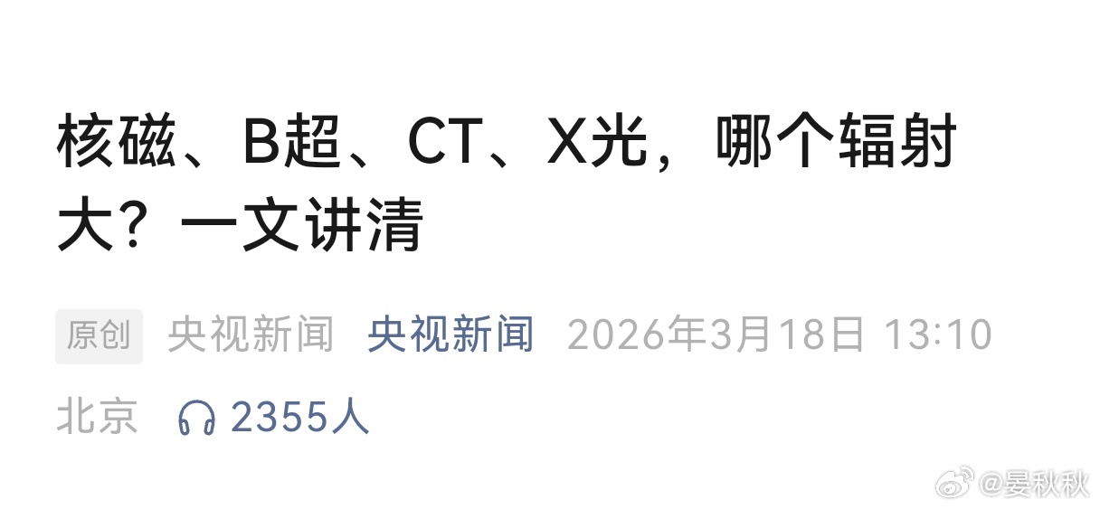 最近有个新闻,说的是一位患者在做核磁共振时,被医生不小心遗忘在检查室里6个小时。这件事听着,就让人捏把汗。不少人问,被忘在里面那么久,会不会受到严重的辐射伤害啊?还有人问,我们平时到医院里,做的核磁、B超、CT、X光这样的影像检查,到底有没有辐射,有的话又有多大。根据“央视新闻”,您可以记住一个很形象的对比:核磁共振和B超的辐射,“等于0”;拍一次普通X光片(比如胸片)的辐射量,大概“等于”我们在自然环境里生活10天,所受到的背景辐射;而做一次胸部CT检查的辐射量,则大约“等于”2到3年的自然背景辐射。先说“遗忘6小时”这个新闻,核磁共振名字里带个“核”字,但这个“核”指的是人体水分中的氢原子核。核磁共振的整个过程,完全没有使用X射线或者放射性物质,所以根本不存在老百姓常说的那种“辐射”。再说B超,就更“温和”了。它就像蝙蝠和海豚用的那种声波探测,整个过程同样没有任何辐射。所以呢,孕妇产检、儿童检查,B超是首选。真正有辐射的,主要是X光和CT。它们用的都是X射线,属于“电离辐射”,过量接触确实可能增加健康风险。不过,也不用过度紧张,医疗检查的辐射量,都是严格控制的。普通的X光摄影,比如拍个胸片看看肺,或者拍个片子看看骨头折没折,辐射剂量非常低,只相当于您在自然环境里生活10天所接受的辐射,可以认为是微乎其微。而CT的原理,是让X射线围着您身体转圈多层扫描,然后再由电脑重建成一层一层的横断面图像,能发现非常微小的病变,比如早期的肺癌。正因为看得这么精细,它付出的“代价”就是,辐射剂量比X光要高不少。做一次胸部CT,接受的辐射量大约相当于拍了上百次胸片,也相当于积累了2到3年的自然背景辐射。所以,医院不会让你随便做CT。做核磁共振被遗忘6小时会经历什么晏秋秋