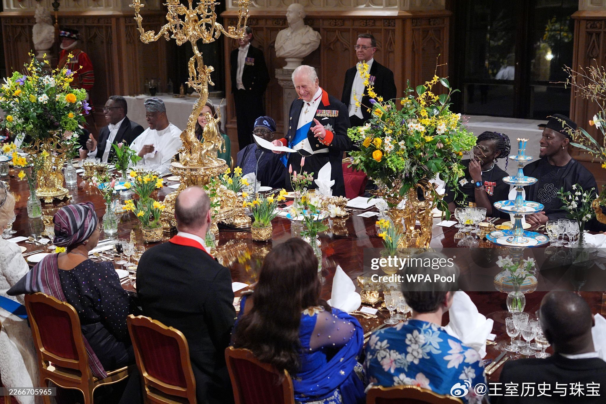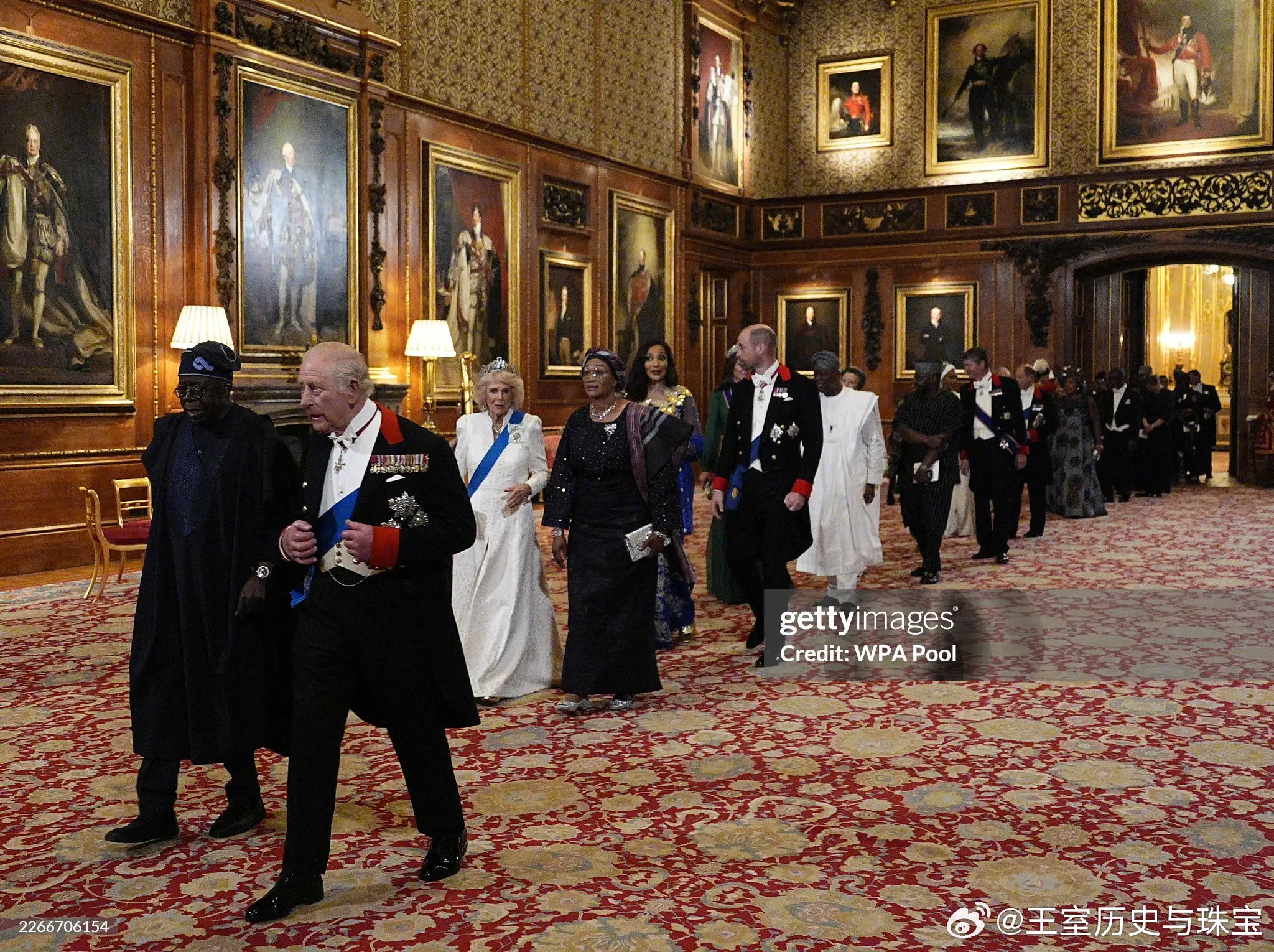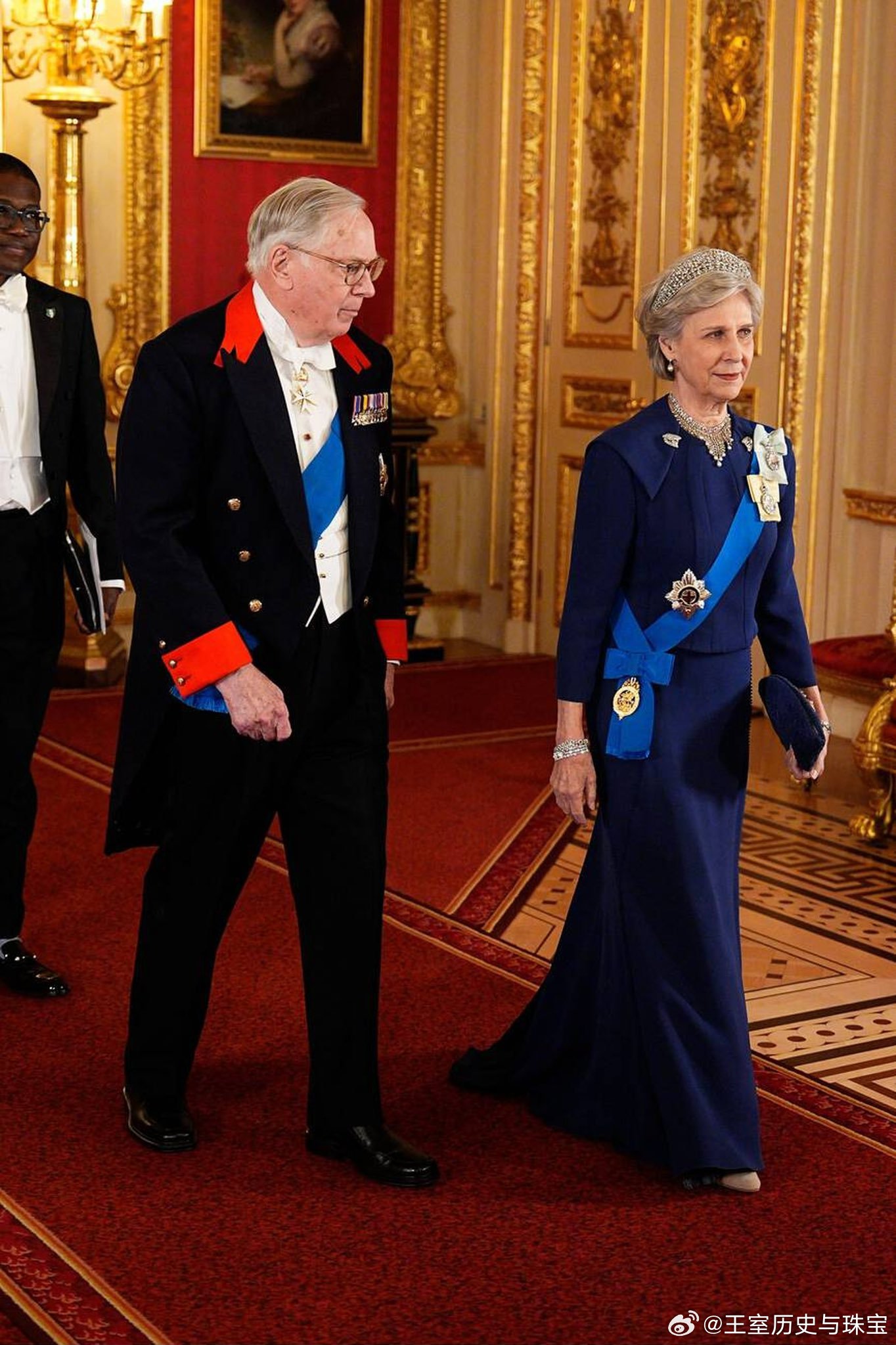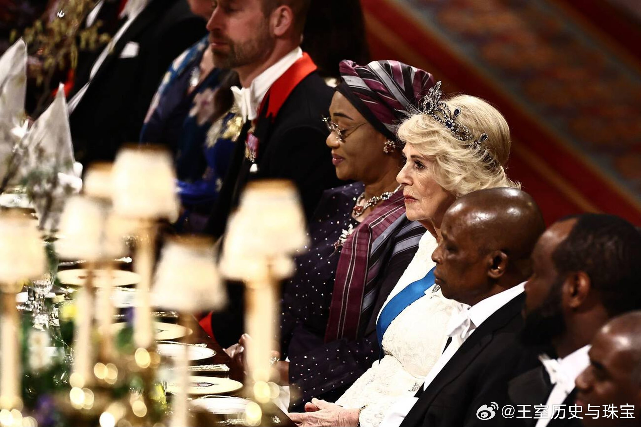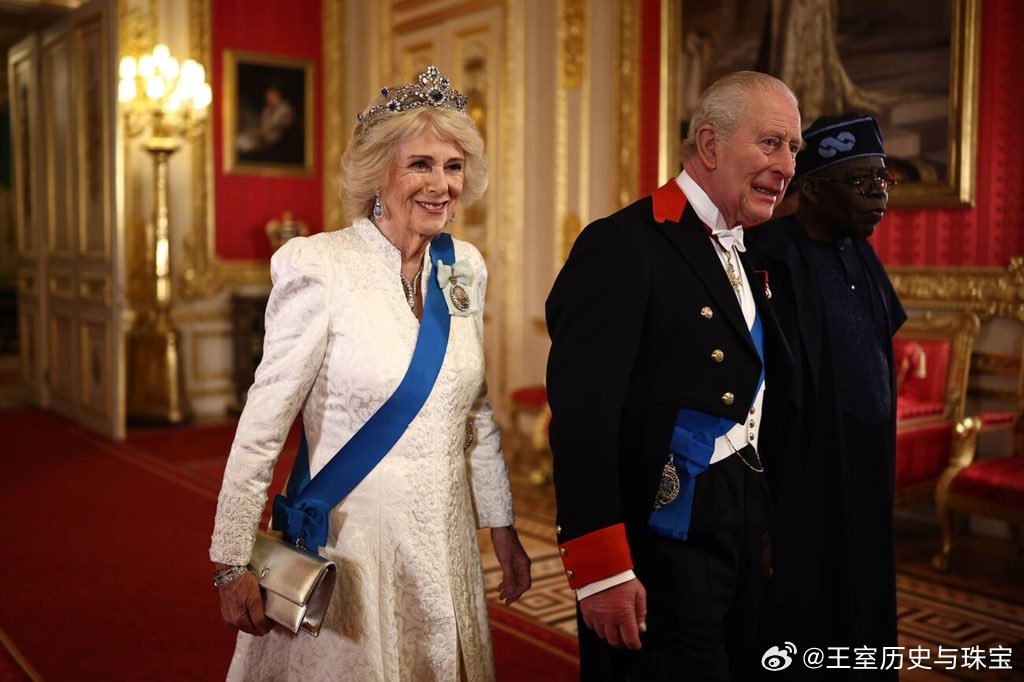 新闻 2026.3.19 尼日利亚国事访问英国Day 1晚宴部分,卡米拉新解锁乔治六世蓝宝石项链套装(George VI Sapphire Parure)里的耳环(她没耳洞之前一直没解锁伊丽莎白二世留下的耳环,看来现在都改成耳环开始霍霍了),珍珠泪继续开启新一年被毁,爱丁堡公爵夫人苏菲缺席。