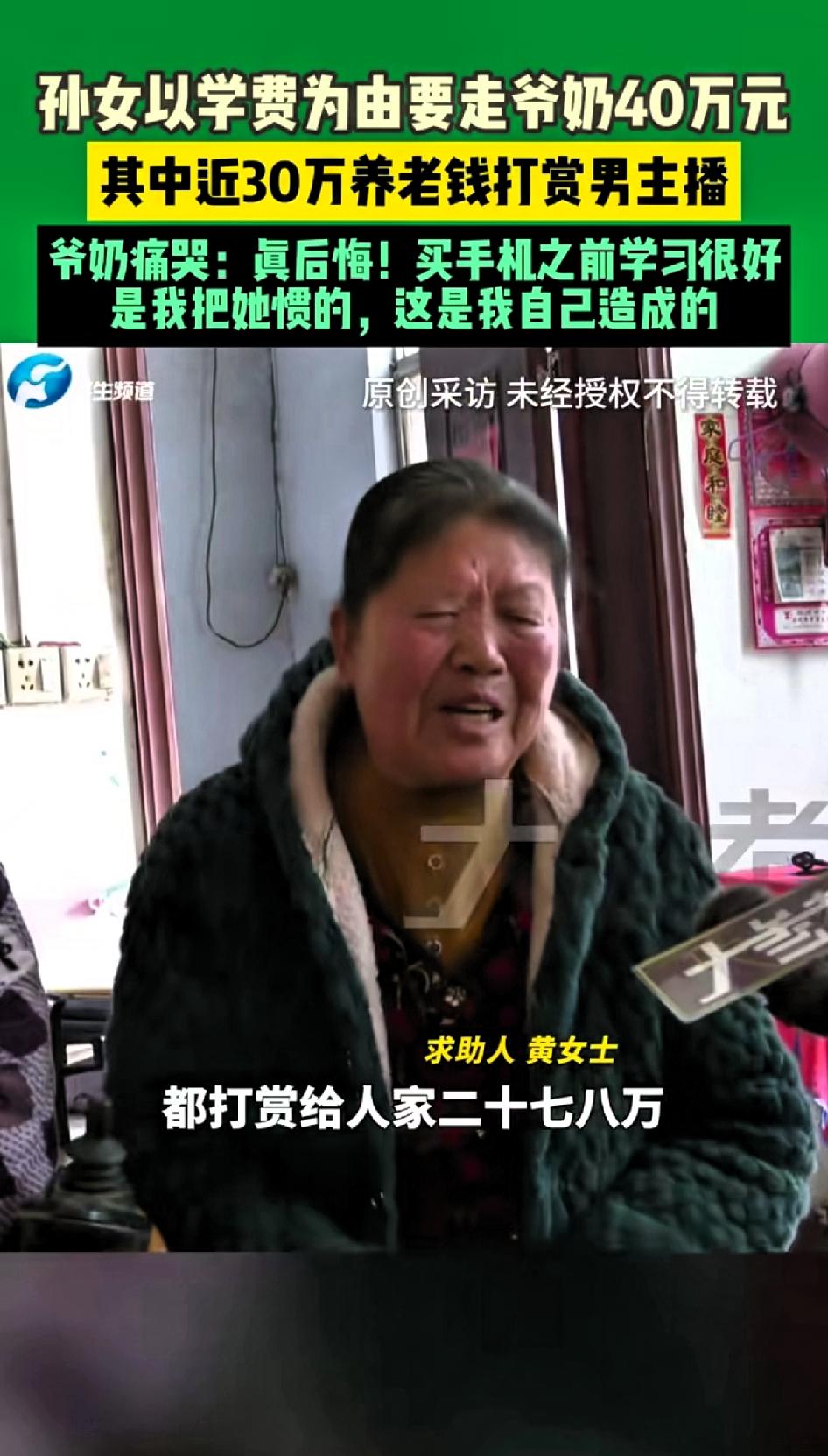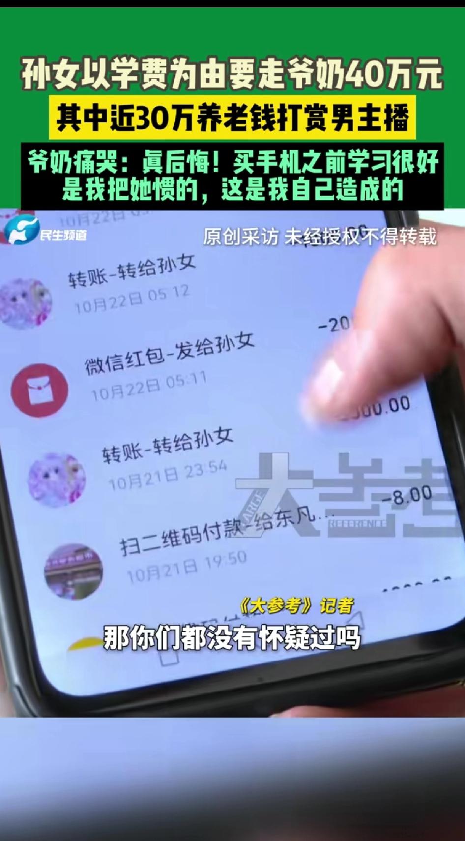孙女以学费为由向爷爷奶奶要走40万元,其中近30万养老钱打赏给男主播。爷爷奶奶痛哭:真后悔!买手机之前学习都很好!奶奶哭着表示怪自己把孩子惯的不体谅父母的辛苦,现在把自己的养老钱都打赏给陌生人。 想象一下,爷爷奶奶辛苦攒下的养老钱,就这么没了,老人一提起来就哭,后悔得睡不着觉。这对老人来说,打击得多大啊。看视频里两位老人衣着朴素,这40万可能是老人一辈子辛苦积攒的积蓄,指着这40万养老呐!没想到就这样被孙女打赏给了外人。 现在网络环境复杂,一些年轻人容易沉迷其中,做出不理智的行为。家长也要看好钱包,教育好孩子,骗子太多并且想方设法行骗。 希望这能给大家提个醒,家长要多关注孩子的消费行为,年轻人也要有正确的消费观,别让爱你的人寒了心。