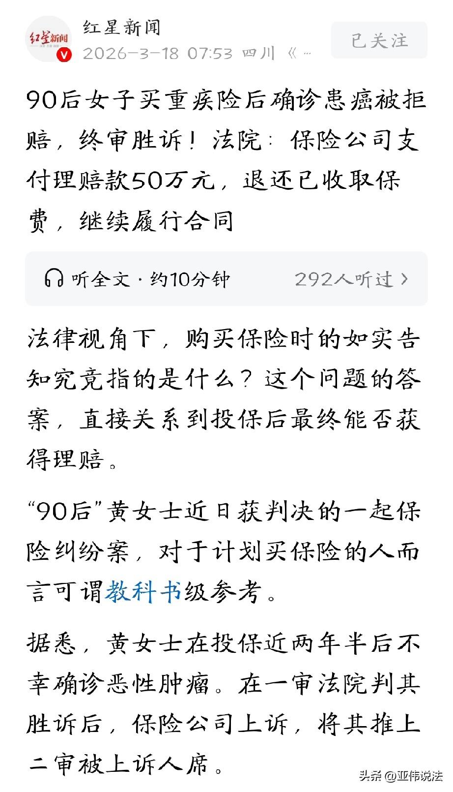北京,90后女子母亲和外婆都患过癌症,女子也担心自己的身体状况,便买了份保额50万的重疾险来兜底。万万没想到,两年多后,自己竟真的查出肺腺癌,伤心之余又感到庆幸,便赶紧向保险公司提出了理赔申请。可万万没想到,保险公司竟以“她故意隐瞒家族肿瘤遗传史”为由拒绝了。女子觉得保险公司纯粹就是想抵赖,一气之下告上法庭,法院的判决亮了。 黄女士是一名90后,别看她年轻,但很有先见之明,出于对未来健康的担忧,她觉得,应该给自己买一份保险做保障。 经过精挑细选,2022年8月,她在一家保险公司购买了重大疾病保险,保险金额为50万元。 双方还约定,要是确诊重疾,后续保费就豁免,不用交了,这些都白纸黑字写到了保单里。 有了这份保险,黄女士放心多了,就算以后真有个啥大病,也能有个兜底的,不至于让这个家垮了。 万万没想到,2025年1月,命运跟她开了个残酷的玩笑,她被确诊为肺腺癌。 这个消息如同一颗重磅炸弹,让黄女士一家震惊又担心。 但黄女士很快振作起来,她想起了自己买的那份重疾险,心想这下有救了,能拿到那50万元理赔款,来支付这高昂的治疗费用。 于是,黄女士向保险公司提出了理赔申请,可万万没想到,保险公司竟以“她故意隐瞒家族肿瘤遗传史”为由拒绝了。 原来,黄女士的母亲患乳腺癌、卵巢癌、外婆患肺癌。 保险公司认为,黄女士明知自己存在重大肿瘤家族遗传风险,却在投保时没有如实告知,主观上存在故意,所以不同意她的全部诉求。 听到这个理由,黄女士又气又委屈,因为投保时,自己明明已经跟销售人员说过亲属患肿瘤的情况,是销售人员没有进一步详细询问,怎么能把责任都推到自己头上呢? 她越想越气,绝对不能就这么算了,于是,向法院提起了诉讼。 法院经过调查审理,认为黄女士并没有违反如实告知义务。 因为保险公司在《个人保险电子投保单》中询问的内容是“被保险人是否目前患有或曾经患过遗传性疾病”,而不是询问肿瘤家族史的情况。 而且,保险合同中对遗传性疾病的释义里,也没有涉及肿瘤家族史的任何表述。 从医学专业角度和普通金融产品消费者的认知来看,都不能认定“肿瘤家族史”属于“遗传性疾病”。 同时,黄女士已经如实告知了销售人员亲属患有肿瘤的情况,销售人员没有进一步询问,也没有拒绝继续投保。 综上,一审法院判决:保险公司向黄女士支付保险金50万元,豁免黄女士后续保费,并向黄女士退还保费6454元,保险合同继续有效。 本以为官司赢了,自己就能顺利拿到理赔款了。 可没想到,保险公司不服一审判决,再次提起上诉。 《保险法》第十六条规定:订立保险合同,保险人就保险标的或者被保险人的有关情况提出询问的,投保人应当如实告知。 投保人故意或者因重大过失未履行前款规定的如实告知义务,足以影响保险人决定是否同意承保或者提高保险费率的,保险人有权解除合同。 二审法院认为,黄女士已经尽到了如实告知的义务,在保险期间内确诊了合同约定的重大疾病,且没有违反告知义务,保险公司不享有合同解除权。 而且,保险公司也没有发出过解除合同通知,合同仍处于继续履行状态,黄女士确诊重大疾病后应根据合同约定豁免后续保费。 最终,二审法院驳回上诉,维持原判。