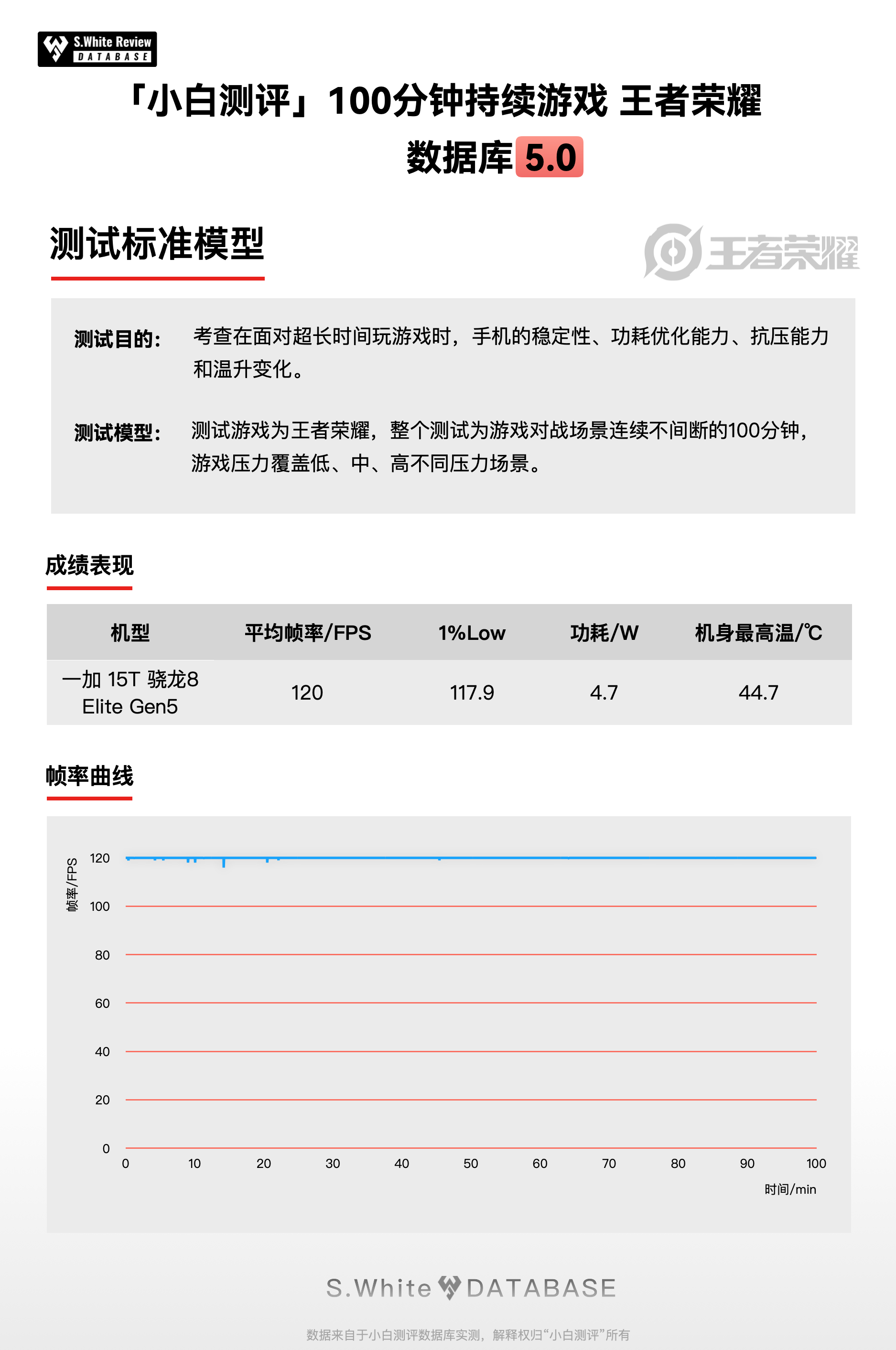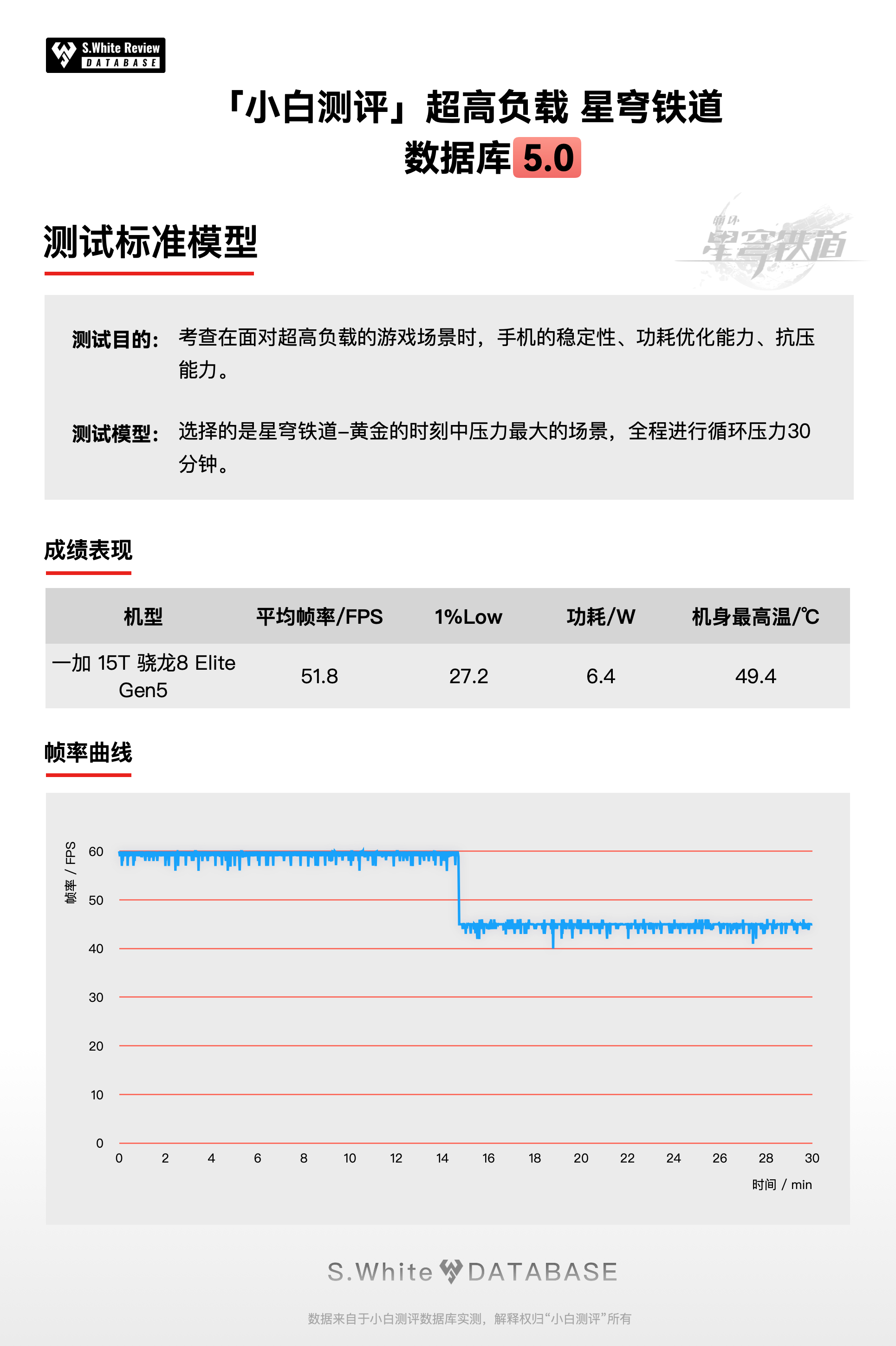 *数据详情:《100分钟持续游戏-王者荣耀》:平均帧率120FPS(满帧120),1%Low帧117.9,功耗4.7W,机身最高44.7℃;《超高负载-星穹铁道》:平均帧率51.8FPS(满帧60),1%Low帧27.2,功耗6.4W,机身最高49.4℃;