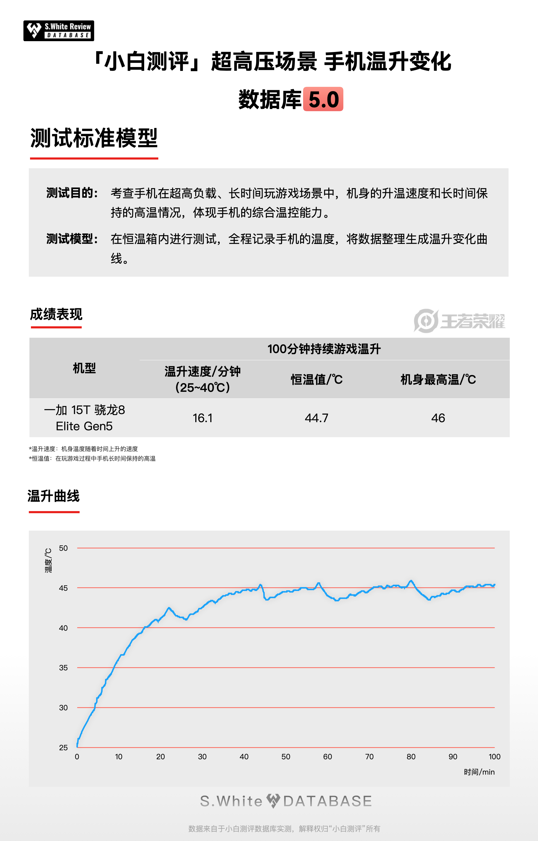 3、手机温升测试:100分钟持续游戏,温度从25℃升到40℃用时16.1分钟,手机温度达到相对平衡时的温度是44.7℃,全程测试机身最高46℃。