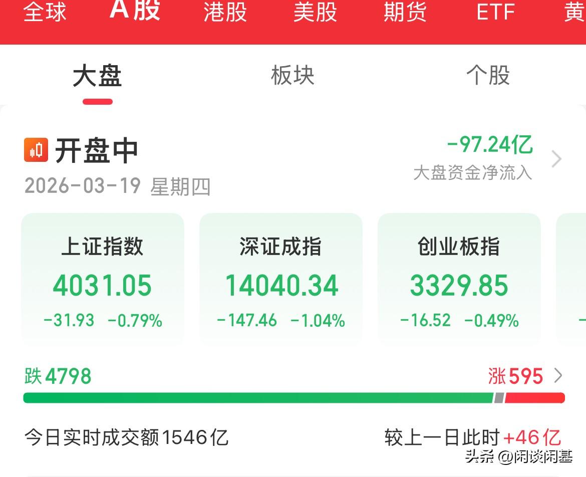 涨一天跌一天,指数全线低开,大有那种血洗一波的感觉,明天又是交割日,原油暴涨,布伦特原油期货重回110美元/桶,美联储鲍威尔释放鹰派信号 伊朗能源设施首次遭打击,导致本就供应短缺的市场更加岌岌可危了,加剧市场对能源供不应求的担忧,原油市场全线暴涨,猛拉啊,布伦特原油期货一晚直接拉10美元/桶, 此外美联储昨晚公布最新利率决议,如市场预期那般不降息,但随后发布会上鲍威尔释放鹰派信号,就三个字短期不降息,原因是中东冲突导致能源上涨,油价飙升,从而导致通胀抬头,市场预期2026年美联储降息可能性已经不足50%了, 双重叠加,美股全线跌幅超1%,美元美债走强,亚太市场早盘全线低开,A股三大指数全线低开,创业板拉升跌幅0.5%,港股三大指数全线低开,恒生指数低开2%, 今天的目标就是少亏都是赚的,外围的不确定性,加剧了市场的避险情绪,都选择在观望,毕竟冲突持续多久都是未知数。