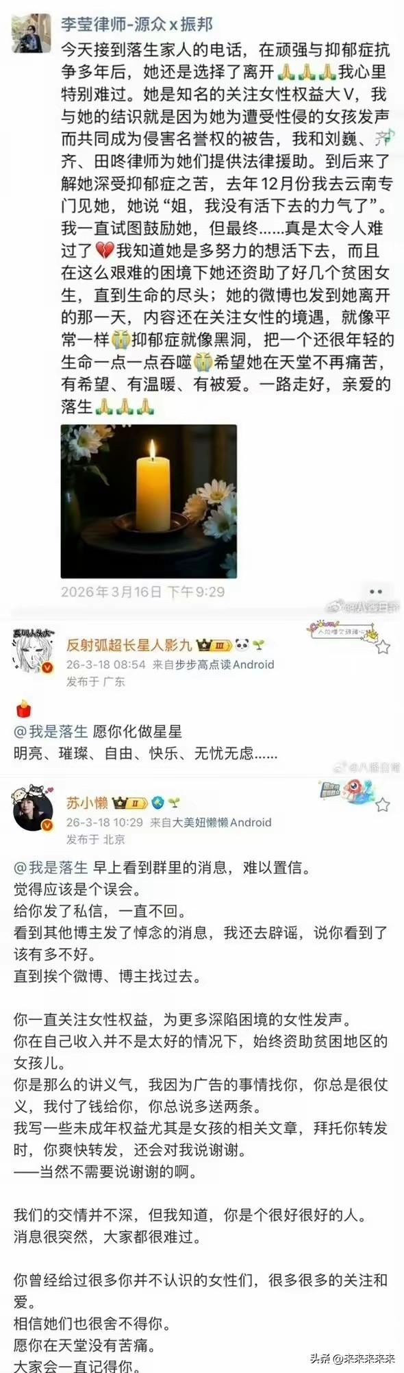近日,拥有89.7万粉丝的社交平台博主“落生”离世的消息,在网络上引发了持续的讨论。根据公开的相关信息,她最终选择自行了断的方式,结束了自己的生命。 作为在极端女权领域有不小影响力的博主,“落生”的账号积累了近90万粉丝,过往发布的内容,一直以极强的攻击性和非黑即白的判断逻辑出圈。翻看她此前的发言,能清晰看到她一以贯之的表达逻辑——所有不符合她认知标准的内容,都被归为需要被反对、被推翻的存在。 她曾公开表态支持南非的紫色女权运动,认同该运动中针对男性设定的严刑苛法;也不止一次在内容中提到,婚姻里男方不给彩礼,本质上就是对女性的剥削。在涉及恶性刑事案件的公共讨论中,她曾明确提出,即便是患有精神疾病的男性杀人犯,也应该一律判处死刑,甚至还公开支持对相关犯罪者实施阉割刑。 就连和性别议题关联不大的AI工具使用,她也曾出手干预。此前她曾公开发声,反对AI使用者的言论自由,认为平台应该直接禁止用户使用AI发布“催婚”相关的内容。 这些极具冲突性的言论,为她带来了源源不断的流量和关注度,也让她在同好圈子里获得了大量的认同与追捧。但与此同时,她也把自己困在了一个完全封闭的认知闭环里。在她的表达体系里,世界只有两种颜色,非对即错,非黑即白,但凡和她的观点有出入,就是不可饶恕的“不公”。正常的社会运行规则里,那些不符合她预期的部分,都成了她眼里“不正常”的证明。 她一直试图用自己的这套极端标准,去改变她眼里“处处不对劲”的世界,去扭转那些她看不惯的规则。但现实的走向,从来不会因为某个人的激烈言论,就彻底偏离既定的轨道。这个社会有它自己的运行逻辑,不会因为某个人的极端表达,就彻底改写规则。 她在网络上掀起过一次又一次的舆论风波,用激烈的言辞攻击过无数和她观点不同的人,也靠着这些对立的情绪,一步步把账号做到了近90万粉丝的体量。只是没人想到,她一路靠着这套表达逻辑走到了现在,最终也以这样的方式,给自己的人生画上了句号。 如今人已离世,她过往那些激烈的、充满戾气的发言,也随着账号的沉寂,慢慢在信息流里失去了声响。不少看过她内容的网友,回头再看这一路的轨迹,只留下一声唏嘘。