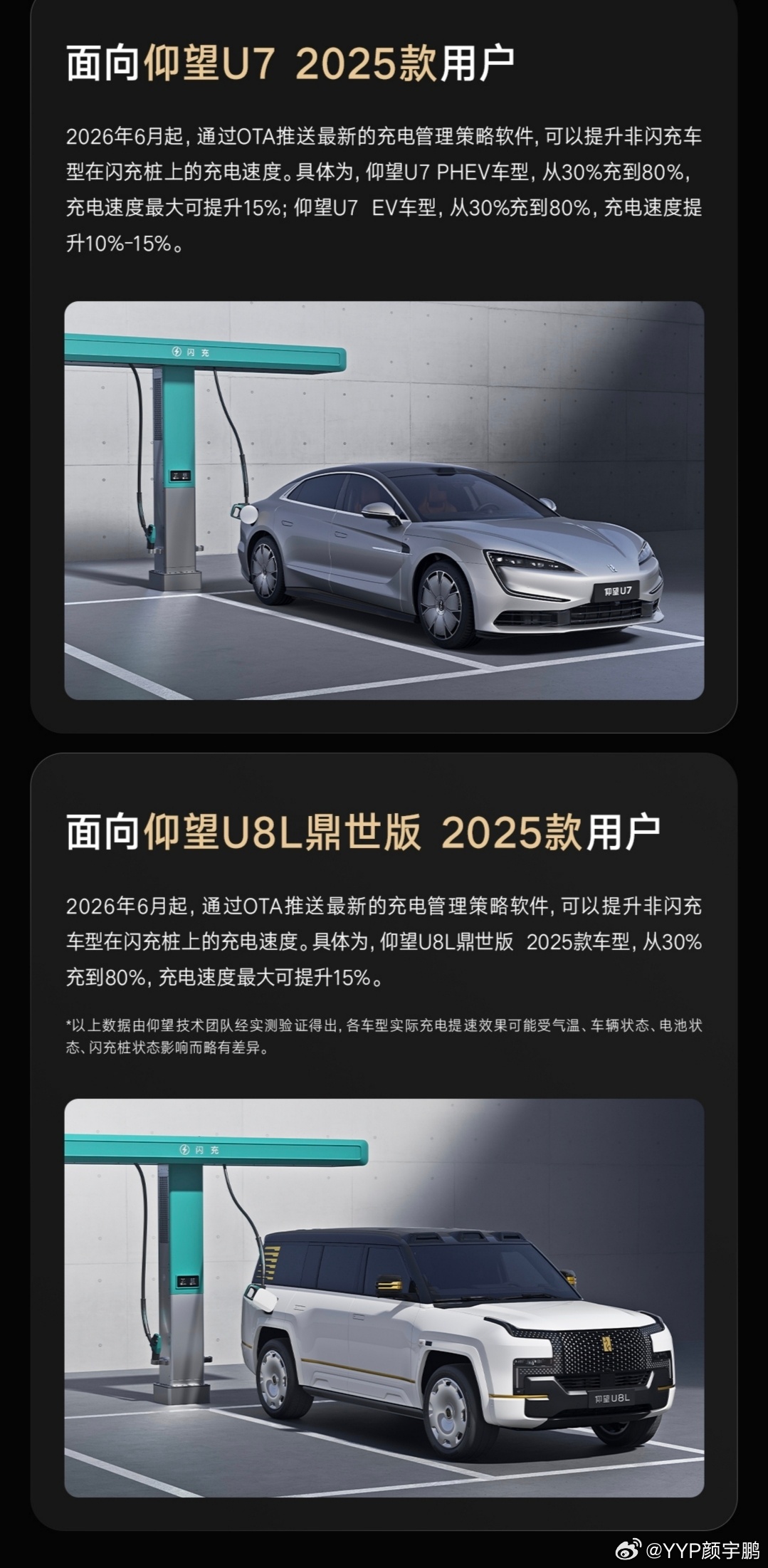 一是为了配合闪充,现款的U7和U8L充电速度升级,在闪充桩上最多可以加速15%。
