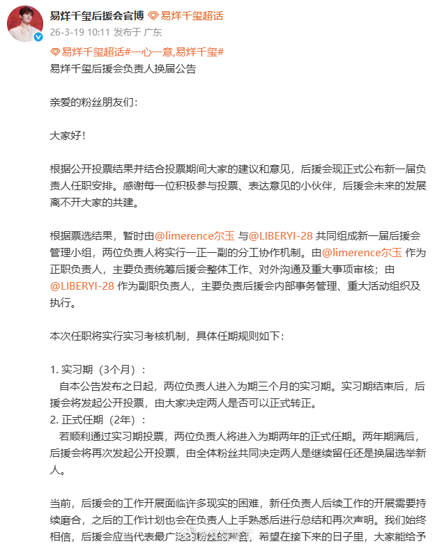 易烊千玺后援会负责人换届 易烊千玺后援会负责人换届公告 千家专属好消息!后援会负责人换届正式官宣,全新管理团队带着信任出发,未来一路相伴~