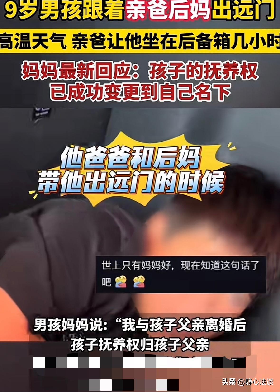 “有后妈就有后爹!”广东佛山,9岁男孩父母离婚,男孩跟父亲生活,父亲重组家庭后,带连老带小一家7口出去旅游,由于座位不够,就让男孩躺进后备箱往返1000公里,母亲得知后心疼不已,找男孩父亲讨要说法,谁知男孩父亲并不觉得有什么问题,后来母亲将前夫起诉,要求把儿子的抚养权变更并要求男孩父亲和继母公开道歉,遭到拒绝!男孩父亲:我给他花钱眼都不眨一下,就躺个后备箱怎么就有问题了! 同是亲生骨肉,9岁男孩竟被亲爹当成了多余的人。 男孩辰辰今年9岁了,自打父母离婚后,就跟着父亲一起生活。 后来父亲又结了婚,家里添了继母和带来的儿子,后来又有了其他孩子。 直到不久前,父亲带着一家7口出门旅游,满心欢喜规划着行程。 可一家7口挤在车里,算来算去少了一个座位,父亲便安排继母抱着婴儿坐在副驾。 爷爷奶奶和继母的儿子坐在后排,9岁的辰辰躺进了汽车后备箱里。 旁边还放了一辆婴儿车,辰辰虽然不愿意,也没敢反驳。 1000公里的往返,不算短的路程,一路上车子走走停停。 辰辰在后备箱里蜷缩着身体,看着前面车厢里一家人的欢声笑语,心里是什么滋味,没人能体会。 也许他也期盼过,父亲能想起他,让他坐到车里来,哪怕挤一挤也好。 可直到旅途结束,他也只是后备箱里那个隐形的孩子。 他不懂,为什么同样是家里的孩子,别人能舒舒服服坐在车里,而自己却只能待在后备箱。 这事他一直憋在心里,直到跟自己的亲生母亲聊天,辰辰说起这个事。 当母亲从孩子口中得知,被亲爹塞进后备箱跑了1000公里时,心疼得直掉眼泪,心里又气又急。 她怎么也不敢相信,那个曾经口口声声说爱孩子的男人,竟然能做出这样的事。 全然不顾孩子的安全,更不顾及孩子的感受,她立刻找到前夫,想为孩子讨要一个说法。 面对她的质问,前夫不仅没有丝毫愧疚,反而理直气壮,觉得自己根本没错。 在他眼里,自己给孩子花了钱,供孩子吃穿,就已经尽到了做父亲的责任。 不过是让孩子躺了趟后备箱,这点小事根本不值得揪着不放。 前夫的冷漠,他的不以为然,也让她彻底看清,辰辰在这个重组家庭里,根本得不到应有的关爱和尊重。 而那个继母,自始至终也没有说过一句公道话,仿佛后备箱里的那个孩子,跟自己毫无关系。 在这个新的家庭里,辰辰就像一个外人,连最基本的被尊重都成了奢望。 一想到辰辰的委屈,母亲再也无法忍受,她下定决心,要为孩子争取应有的权益。 随即向法院提起了诉讼,要求变更孩子的抚养权,让孩子回到自己身边。 《民法典》第56条:具有下列情形之一,父母一方要求变更子女抚养关系的,人民法院应予支持: (一)与子女共同生活的一方因患严重疾病或者因伤残无力继续抚养子女。 (二)与子女共同生活的一方不尽抚养义务或有虐待子女行为,或其与子女共同生活对子女身心健康确有不利影响 (三)已满八周岁的子女,愿随另一方生活,该方又有抚养能力 (四)有其他正当理由需要变更。 2024年11月,辰辰生母成功变更抚养权,辰辰回到母亲身边。 后来,辰辰母亲又以辰辰的名义,起诉生父和继母,为自己的行为公开道歉。 对此,男孩的父亲拒不认账,坚决不肯道歉。 他觉得自己的做法合情合理,甚至觉得孩子母亲是在无理取闹。 他承认让孩子躺在后备箱,无非就是超载,怎么就对他不好了。 他自始至终都觉得,让辰辰躺在后备箱里,就是在正常不过的一件小事。 法院经过审理,判决辰辰父亲并未对辰辰造成不良影响,所以不支持公开道歉。 但放任孩子坐后备箱的行为构成健康权的侵害,判赔精神损害抚慰金3000元。 判决下来后,辰辰父亲不服,提出上诉,截至目前,事情还在审理中。 有人说,父母离婚,受伤的永远是孩子,尤其是当一方重组家庭后,孩子很容易就成了那个被忽视的人。 其实从坐车的重要程度就能看出,第一是新妻子和新孩子,然后是父母和继子,最后才到9岁的亲生儿子。 9岁的辰辰,本该在父亲的呵护下长大,却因为家庭的变故,成了后备箱里的孩子,他的委屈,他的无助,没人真正放在心上。 而父亲那句我给他花钱眼都不眨,更是暴露了他的自私和无知,他以为金钱就能弥补所有的爱。 有人说,既然把孩子带到这个世界上,就该尽到为人父母的责任,就算家庭散了,爱也不该散。 对此,我们不得不思考,在重组家庭里,该如何平衡对各个孩子的爱?父母离婚后,又该如何保护孩子的心灵,不让他们受到二次伤害? @静心法谈 学法辨是非,慬法不到吃亏。