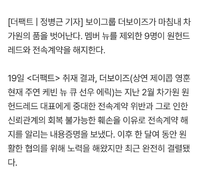THEBOYZ九人解约THEBOYZ称公司存在重大违约行为 据韩媒,THE BOYZ除成员NEW之外,其余9人将与One Hundred解除专属合约。成员们称公司存在重大违约行为,无法达成协商。