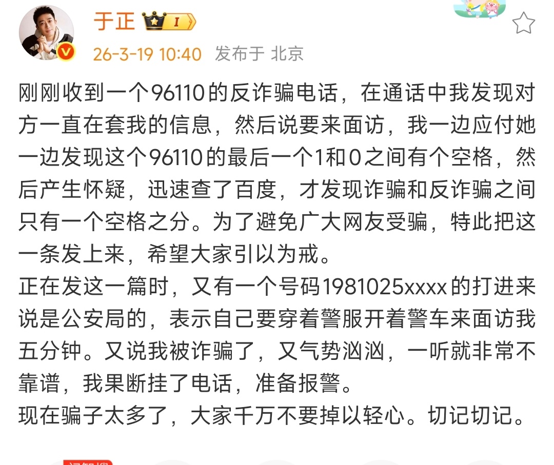 于正收到反诈骗电话于正接到96110反诈骗电话 于正发文说自己接到了96110反