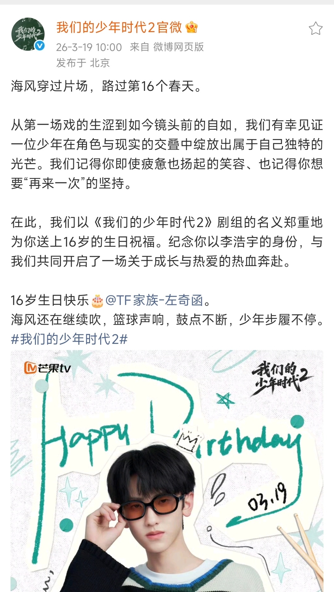 我们的少年时代2为左奇函庆生 我们的少年时代2发文为左奇函庆生,弟弟16岁了:纪