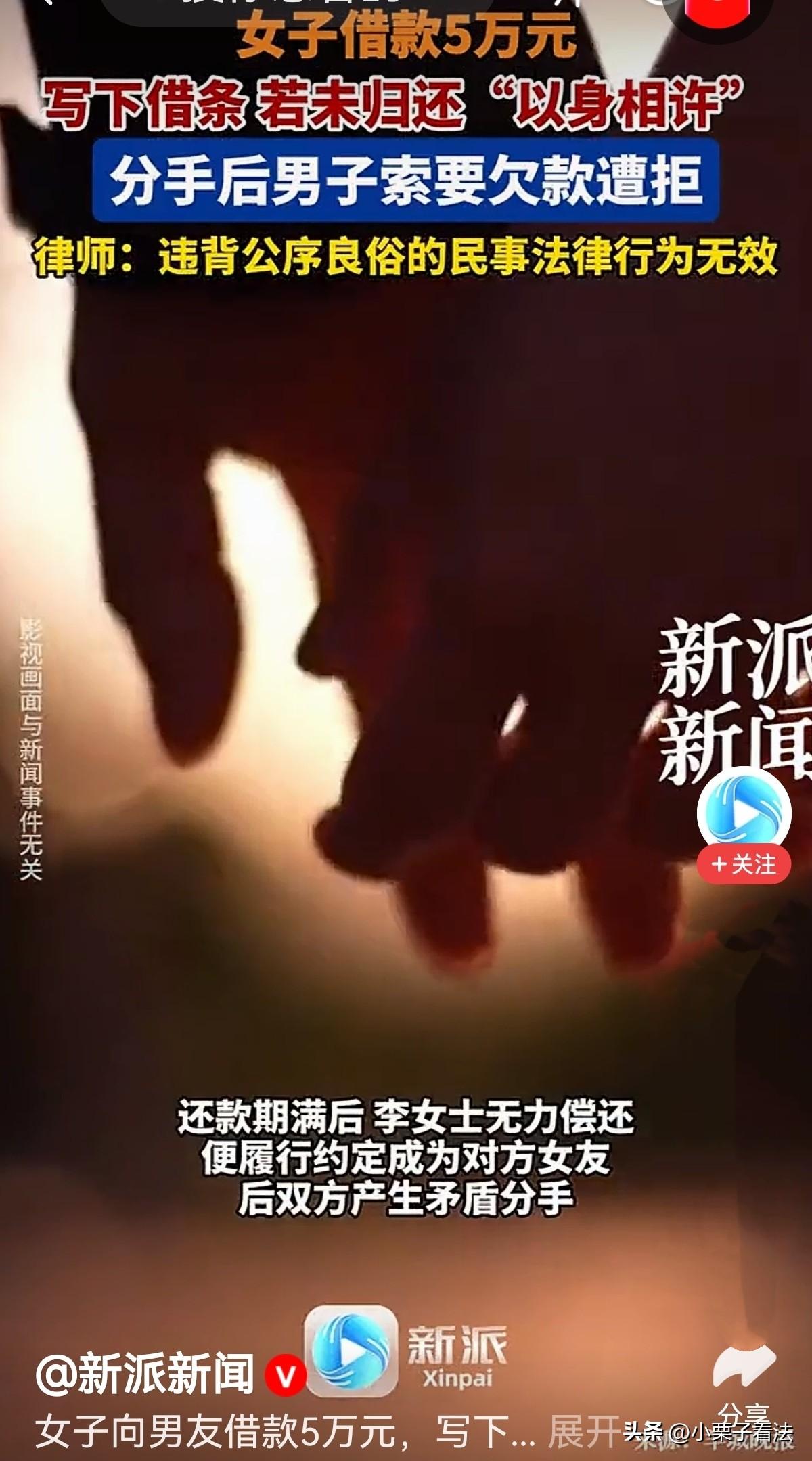 白嫖成功了!女子向男子借了5万元,男子问她要是还不上咋办?女子没犹豫:还不上就以身相许!男子同意。女子约定了还款日期并写了借条。谁知,还款期满,女子真没钱还,只能去做男子女朋友。后两人发生矛盾分手,男子转头就要那5万元欠款。女子怒了:我已履约,钱不还了!你出尔反尔?网友:这男人不讲武德! 生活里总有些让人哭笑不得的奇葩事,感情和钱搅在一起,往往会闹得一地鸡毛。李女士做生意,手里资金周转不开,房租、日常开销压得她喘不过气,四处借钱又碰了壁,思来想去,她找到了平时关系还不错的朋友张先生。 张先生有着稳定的工作和一定的积蓄,两人相识多年,虽没有深交,但日常相处也算融洽。抱着试一试的心态,李女士主动联系了张先生,说明了自己的处境,希望能向他借5万元应急,并承诺会尽快归还。 张先生得知李女士的情况后,犹豫了片刻。5万元并非小数目,他担心李女士的生意状况难以在短期内好转,到时可能无法按时还款。 思索再三,他向李女士提出了自己的顾虑:“这5万元我可以借你,但你得想清楚,要是到了约定日期还不上咋办?” 面对张先生的疑问,李女士没有丝毫犹豫,或许是急于拿到借款缓解燃眉之急,或许是一时冲动,她当即回应道:“要是还不上,我就以身相许,做你女朋友!” 这样的答复让张先生有些意外,但他看着李女士坚定的眼神,又考虑到两人平时的交情,最终同意了借款。 随后,李女士当场写下了借条,明确了借款金额为5万元,并约定了具体的还款日期。借条上只写明了借款相关信息,对于“还不上就以身相许”的口头约定并未提及。拿到5万元后,李女士如释重负,连忙用这笔钱支付了房租和货款,暂时化解了经营危机。 然而,事与愿违,李女士的生意并没有像预期中那样好转,反而因后续的市场波动愈发艰难。约定的还款日期转眼就到,李女士盘点了自己的收支情况,发现确实没有能力偿还这5万元欠款。 想起当初的口头约定,她虽有些无奈,但也只能履行承诺,主动联系张先生,表示愿意按照之前说的,做他的女朋友来抵偿欠款。 张先生对此没有异议,两人便正式确立了恋爱关系。起初,他们的相处还算和谐,张先生体谅李女士的经营困境,没有再提及欠款的事情,李女士也努力扮演好女朋友的角色,试图维系这段因借贷产生的感情。 可随着相处时间的增多,两人在性格、生活习惯以及价值观上的差异逐渐显现出来,矛盾也随之不断升级。 生活中的琐碎小事频繁引发争吵,张先生觉得李女士过于强势,在生活中处处想占主导地位;而李女士则认为张先生不够体贴,不理解她经营生意的艰辛,对她缺乏包容。一次次的争执让两人之间的感情逐渐变淡,原本就没有深厚感情基础的恋爱关系,在不断的矛盾冲突中摇摇欲坠。 最终,在一次激烈的争吵后,两人都失去了继续相处下去的耐心,决定分手。本以为这段因借贷而起的纠葛会随着分手画上句号,可让李女士没想到的是,分手后不久,张先生便主动联系她,要求她归还当初借的5万元欠款。 这一要求让李女士怒不可遏,她认为自己已经按照当初的约定,做了张先生的女朋友,算是履行了“以身相许抵偿欠款”的承诺,如今张先生提出分手,反而回头索要欠款,实在是出尔反尔。 她当即反驳道:“当初说好的还不上就以身相许,我已经履约了,现在我们分手了,这5万元钱我不可能再还了!你这样做也太不讲信用了!” 张先生则表示,“以身相许”只是当初借款时的一句玩笑话,不能当真,借贷关系本质上还是金钱往来,李女士没有偿还欠款,就理应归还借款。他认为两人恋爱是恋爱,借贷是借贷,不能混为一谈,分手并不影响他索要欠款的权利。 双方各执一词,互不相让,原本的朋友关系彻底破裂。这件事被身边的人知晓后,迅速在网络上引发了热议。 不少网友表示支持李女士,认为张先生当初既然同意了“还不上就以身相许”的约定,李女士也履行了做他女朋友的承诺,现在分手了又回头要钱,确实是“不讲武德”,违背了当初的约定。 也有部分网友站在张先生这边,觉得“以身相许”这种约定本身就不符合公序良俗,不受法律保护,借贷关系中,欠款人偿还借款是法定义务,不能因为一段失败的恋爱关系就免除还款责任,张先生索要欠款是合理合法的。 还有一些网友认为,这件事的根源在于李女士和张先生当初的约定不够严谨,将金钱借贷与感情捆绑在一起,本身就存在极大的风险。感情是复杂的,而借贷关系是明确的,两者混为一谈,一旦感情出现问题,必然会引发金钱上的纠纷,最终闹得两败俱伤。 如今,李女士和张先生仍未就欠款问题达成一致,双方僵持不下。这件看似奇葩的事情,也给人们敲响了警钟:金钱与感情往往难以两全,借贷关系中,应当明确权利义务,避免口头约定带来的风险,更不应将感情作为借贷的附加条件。 否则,一旦出现变故,不仅可能导致财产损失,还会伤害彼此的情谊,最终陷入难以收拾的局面。