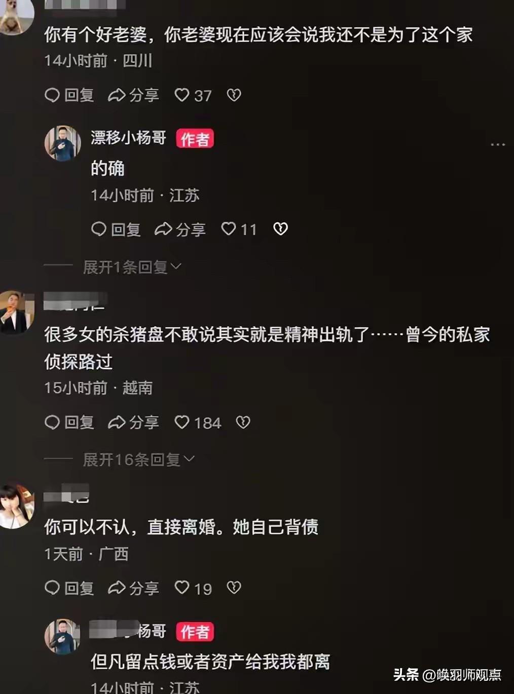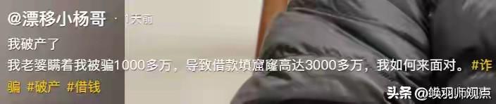 3000万债务压顶!他买房车潇洒养老6年,一夜崩溃:老婆瞒着我借遍全村 2026年3月17日,抖音博主“漂移小杨哥”自曝破产:妻子被骗1000多万后瞒着他借款填窟窿,利滚利滚成3000万巨额负债,还把周边七十多位亲友借了个遍 。 深度解析: 财务专家指出,这是典型的“债务雪崩陷阱”——用高息借款堵漏、错失止损时机、家庭财务不透明,导致1000万变成3000万 。他6年没工作,靠被动收入生活,如今账号仅7000多粉丝,翻身艰难。 历史镜鉴: 2025年,B站顶流UP主“大祥哥”同样因轻信“商业大佬”被骗1249万,被迫卖车、掏空父母积蓄 。心理学“邓宁-克鲁格效应”解释:认知跟不上财富,暴富者更容易被骗 。 唤羽师观点: 3000万不是最可怕的,可怕的是全过程被蒙在鼓里。真正的养老,靠的不是房车派对,而是抗风险能力和持续收入。无房车负债