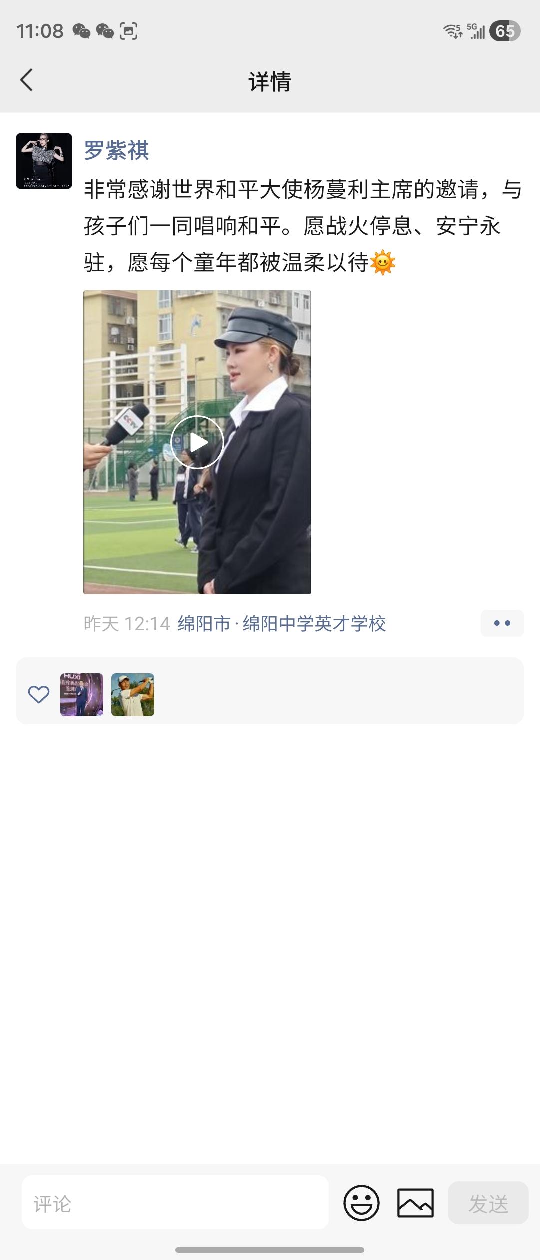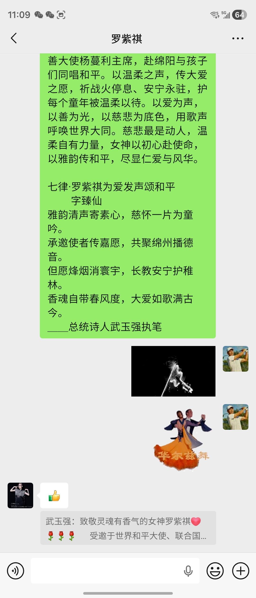 致敬灵魂有香气的女神罗紫祺[心][玫瑰][玫瑰][玫瑰] 受邀于世界和平大使、联合国慈善大使杨蔓利主席,赴绵阳与孩子们同唱和平。以温柔之声,传大爱之愿,祈战火停息、安宁永驻,护每个童年被温柔以待。以爱为声,以善为光,以慈悲为底色,用歌声呼唤世界大同。慈悲最是动人,温柔自有力量,女神以初心赴使命,以雅韵传和平,尽显仁爱与风华。 七律·罗紫祺为爱发声颂和平 字臻仙 雅韵清声寄素心,慈怀一片为童吟。 承邀使者传嘉愿,共聚绵州播德音。 但愿烽烟消寰宇,长教安宁护稚林。 香魂自带春风度,大爱如歌满古今。 __总统诗人武玉强执笔